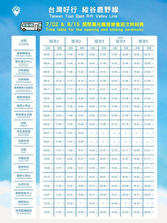 【熱氣球嘉年華怎麼去 交通接駁資訊來囉】2022臺灣國際熱氣球嘉年華即將開跑 你想好怎麼到活動現場了嗎 別擔心~小編都整理好了~ 台東市區鹿野高台 電動巴士免費接駁 【去程】清晨最早04:10在臺東轉運站「第8月台」發車 【回程】僅接駁至鹿野火車站,往臺東市區請至「台灣好行_縱谷鹿野線」查詢時刻表及票價 台灣好行 鹿野縱谷線 : https://reurl.cc/b28nRv 開閉幕交通管制接駁車 7/2(六)、8/15(一)下午將開啟交通管制 開啟交通管制請將車輛停置龍田飛行傘降落場 轉乘付費接駁車至鹿野高台 全票50元、半票25元,回程免費搭乘喔! 6-12歲、身障人士、敬老皆以半票計價 6歲以下免費搭乘 回程免費搭乘* 園區免費環場接駁車 將在鹿野高台三站循環接駁 P1、P2停車場 鹿野高台觀景台 老王咖啡前方站牌 服務時間:05:10-07:00、17:00-18:30 #2022臺灣國際熱氣球嘉年華接駁車資訊 #歡迎搭乘大眾運輸工具 #大家一起減碳遊台東 - 2022-06-20