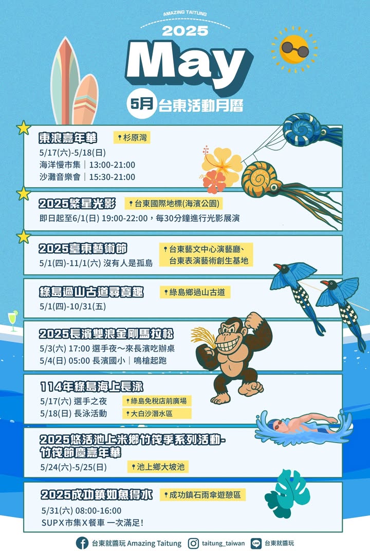 台東「5」告厚勝 .ᐟ.ᐟ這個暑假就來東漂浪一夏 ⬇⬇立即分享給好友⬇⬇ ️必來一夏!東浪嘉年華 5/17(六)-5/18(日) 海洋慢市集|13:00-21:00 沙灘音樂會|15:30-21:00 ️2025繁星光影 6/1(日)前,每晚19:00-22:00 化身大型電玩精彩光影秀 ️2025 臺東藝術節 感受台東文化,避暑好選擇 還有馬拉松、綠島長泳 以及許多台東在地活動節慶! 東浪嘉年華 臺東縣池上鄉公所 臺東縣長濱鄉公所 綠島鄉公所 臺東縣成功鎮公所 #台東 #活動 #台東活動 #台東景點 #台東旅遊 #台東就醬玩 - 2025-04-19