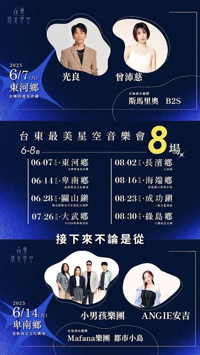 台東最美星空第二波 #卡司公開!暑假繁星點點不間斷 快揪好友東漂來當「追星族」.ᐟ.ᐟ.ᐟ ️08/02(六) 長濱場:高雄市管樂團 ️08/16(六) 海端場:椅子樂團 The Chairs、柯智棠 Kowen ️08/23(六) 成功場:#陳華、甜約翰 Sweet John ️08/30(六) 綠島場:拍謝少年 Sorry Youth、宋德鶴Song of crane ::: 第一波卡司再複習::: ️6/07(六) 東河場:光良 Michael Wong、曾沛慈 Pets Tseng、 ️6/14(六) 卑南場:小男孩樂團 Men Envy Children - MEC Band、 Angie 安吉 ️6/28(六) 關山場:南西肯恩、貝克小姐Miss Bac. ️7/26(六) 大武場:艾怡良 Eve、#王Aden 2025台東最美星空音樂會 免費入場|18:30-21:30| #台東 #活動 #台東景點 #台東最美星空 #最美星空 #觀星 #音樂會 #StarryTaitung - 2025-04-16