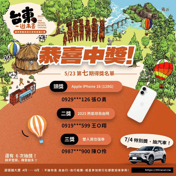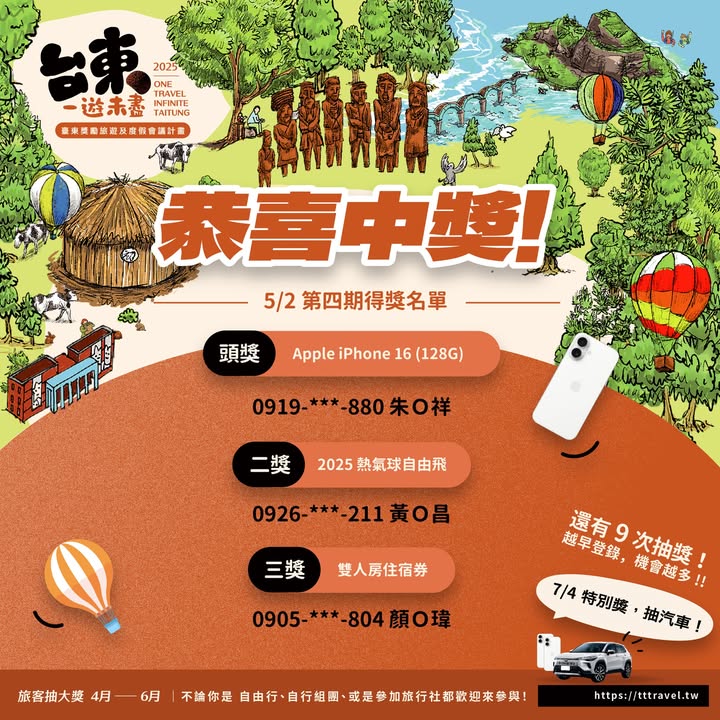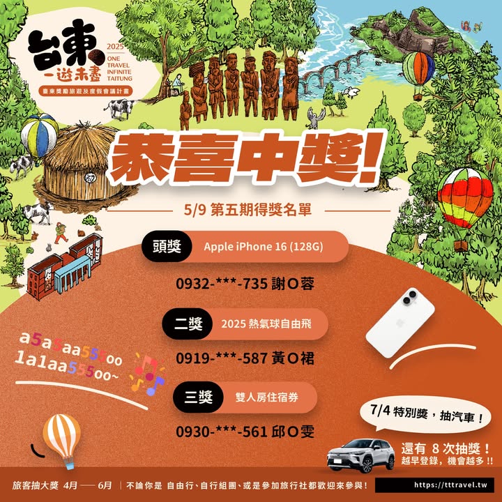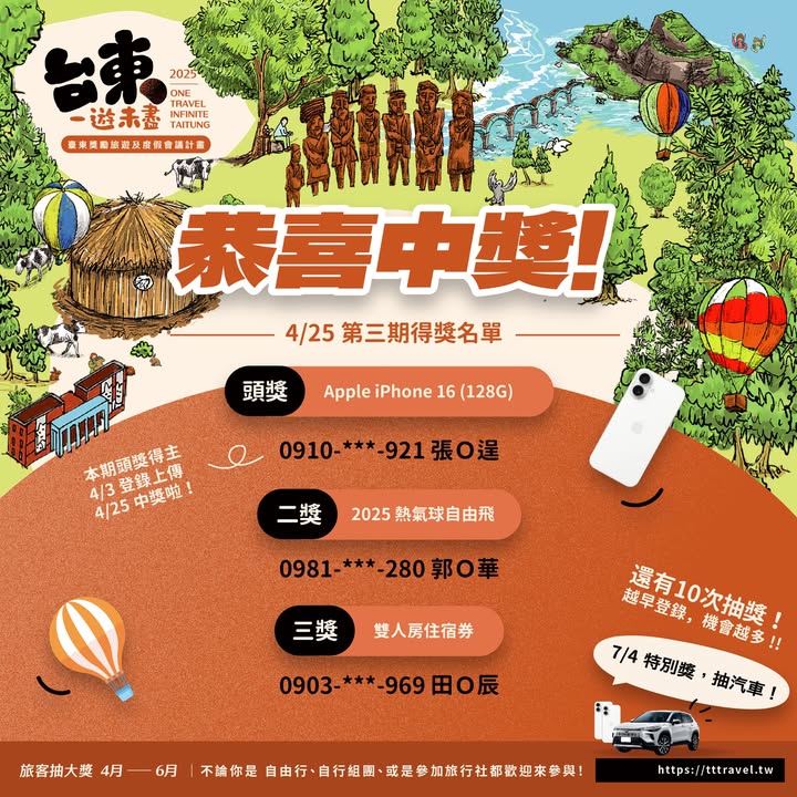 台東一遊未盡 第三期再開獎啦!恭喜以下得主: 頭獎:iPhone 16 128G,得主 0910***921 張O逞 二獎:2025 熱氣球自由飛,得主 0981***280 郭O華 三獎:雙人房住宿券,得主 0903***969 田O辰 得獎者請備好文件領獎: 身分證影本 發票、收據、住宿證明(三擇一)「正本」 (未滿20歲須準備法定代理人同意書、戶籍謄本) 本活動持續到 6/30 (一) 快來參加讓幸運降臨在你身上 尚未中獎者,抽獎資格將持續到最後一期! 7/4(五) 公布特別獎 油電車1台 TOYOTA COROLLA CROSS HEV 究竟獎落誰家?就等你來抽 領獎聯繫 活動專線:0925-819080 Line:@tttravel #台東 #台東一遊未盡 #中獎名單 #活動 #iPhone16 #熱氣球嘉年華 #住宿券 - 2025-04-22