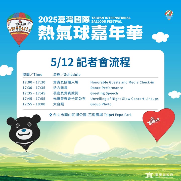倒數𝟯天!熱氣球大事別錯過想親眼看到告五人? 想搶先知道𝟮𝟬𝟮𝟱光雕音樂會的卡司陣容? 𝟱/𝟭𝟮 (一) 𝟭𝟳:𝟯𝟬 #台北市花博公園花海廣場 這一場,真的不能錯過! 首次在花博公園進行熱氣球展演 特別邀請「熊讚」一起回娘家亮相~萌翻全場,絕對是必拍焦點 不容錯過的精彩時刻就在這一天! 沒辦法到現場的球迷也別緊張~ 記得鎖定粉絲專頁,我們會直播同步放送 (展球情況將依當天氣候調整) 快追蹤「臺灣國際熱氣球嘉年華」社群平台,第一手消息不漏接! #熱氣球嘉年華 #台東旅遊 #台東景點 - 2025-05-09