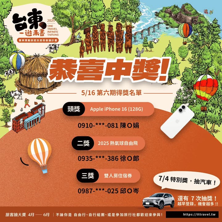 照過來照過來!台東一遊未盡 第六期開獎!六六大順,LUCK LUCK 大順!恭喜以下得主: 頭獎:iPhone 16 128G,得主 0910***081 陳O娟 (登錄序號:TTTRAVEL-2586) 二獎:2025 熱氣球自由飛,得主 0935***386 徐O郞 (登錄序號:TTTRAVEL-1758) 三獎:雙人房住宿券,得主 0987***025 邱O岑 (登錄序號:TTTRAVEL-2317) 得獎者請備好文件領獎: 身分證影本 發票、收據、住宿證明(三擇一)「正本」 (未滿20歲須準備法定代理人同意書、戶籍謄本) 本活動持續到 6/30 (一) 快來參加讓幸運降臨在你身上 尚未中獎者,抽獎資格將持續到最後一期! 7/4(五) 公布特別獎 油電車1台 TOYOTA COROLLA CROSS HEV 究竟獎落誰家?就等你來抽 領獎聯繫 活動專線:0925-819080 Line:@tttravel #台東 #台東一遊未盡 #中獎名單 #活動 #iPhone16 #熱氣球嘉年華 #住宿券 - 2025-05-16