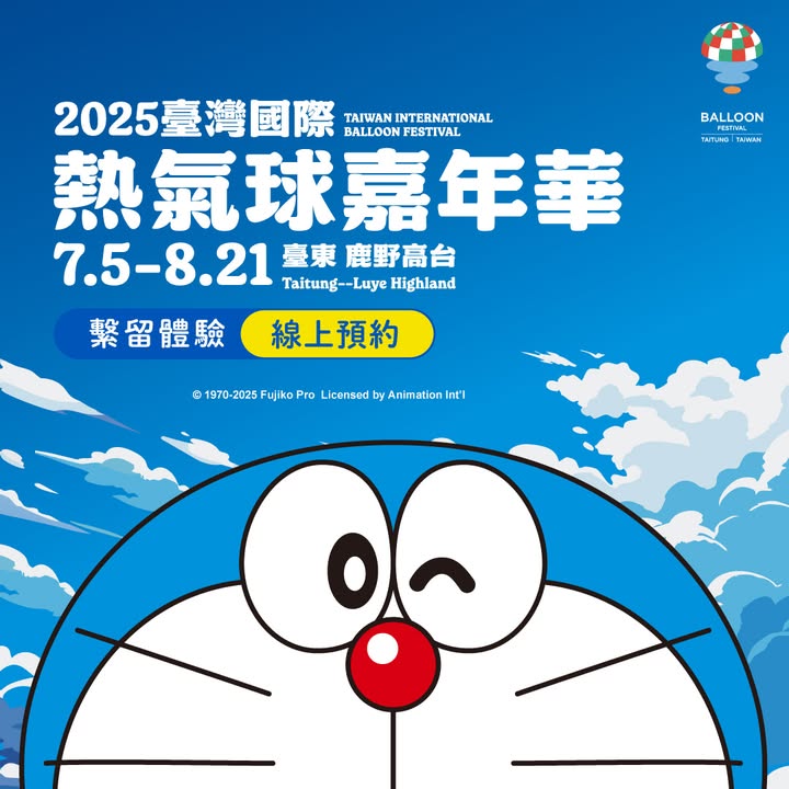 𝟮𝟬𝟮𝟱臺灣國際熱氣球嘉年華 隱藏版海報首度公開!哆啦A夢將領航,陪你展開最精彩的熱氣球旅程! 隱藏版海報搶先看,實體發放日期即將公告 快追蹤「臺灣國際熱氣球嘉年華」社群平台,第一手消息不漏接! 小編幫你整理今年活動亮點 ▸ 全新哆啦A夢熱氣球,全台首度亮相 ▸ 哆啦A夢無人機展演,讓你大開眼界 ▸ 𝟴場一生必看熱氣球光雕音樂會,震撼登場 ▸ 𝟭𝟬組超強卡司,每一場都精彩到尖叫 𝟮𝟬𝟮𝟱 臺灣國際熱氣球嘉年華 ▸ 𝟳月𝟱日-𝟴月𝟮𝟭日 ▸ 造型球展演及繫留體驗時段(繫留體驗以標準球為主) .上午場 𝟬𝟱:𝟯𝟬 - 𝟬𝟳:𝟬𝟬 .下午場 𝟭𝟳:𝟬𝟬 - 𝟭𝟴:𝟯𝟬 ▸ #每週二固定公休 ▸ 繫留購票/追球日誌/停車資訊規劃中 #熱氣球嘉年華 #台東旅遊 #台東景點 - 2025-05-10