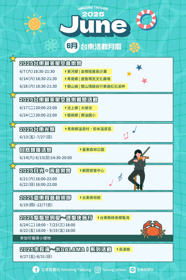 六月來台東「66」٩꒰ᐛ ( ᐖ ꒱۶精彩活動從早到晚不間斷! 快快揪上好友,東漂來旅行 ️ 系列活動 8場超強卡司音樂會 5場音樂體驗活動和眾多星空導覽 更多資訊請鎖定 台東最美星空 ️ 2025台東光祭 各種燈飾裝置,讓夜晚閃亮精彩 ️ 自然醒慢活祭 感受慢台東時光,去你的憂! ️ 2025月光‧海音樂會 彎彎月光下,聽樂團在歌唱 還有許多地方特色、藝文活動 心動馬上行動~住宿交通訂起乃 #台東 #台東景點 #台東旅遊 #台東旅行 #活動 #最美星空 #音樂會 #台東就醬玩 東海岸大地藝術節 TECLandArts Festival 台東光祭 Taitung Light Festival 臺東聲音藝術節 綠島鄉公所 臺東縣長濱鄉公所 自然醒慢活祭 Taitung Spirit Festival - 2025-05-19