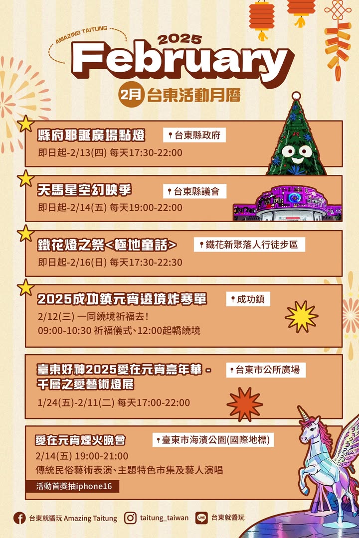 二月份台東精彩活動出爐囉!歡迎分享轉傳讓更多人知道 ️燈飾最後一個月!3個景點全都要打卡 ️臺東好神2025愛在元宵嘉年華 #元宵系列活動 超精彩 ️ 2025成功鎮元宵遶境炸寒單 2/12(三) 一同遶境祈福去! 還有許多美食、美景等你來! 快安排2月來台東感受滿滿的熱情吧 #台東 #台東景點 #活動 #元宵節 #台東就醬玩 - 2025-01-18