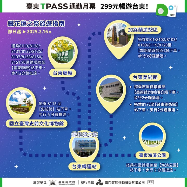 鐵花燈之祭旅遊指南來台東欣賞完 #鐵花燈之祭,還在煩惱接下來的行程嗎? 別擔心!只要有台東TPASS 299元通勤月票,30天內可無限次搭乘台東市區及周邊公車,輕鬆暢遊各大景點,享受慢活台東的美好時光! 精選周邊景點 台東糖廠文創園區|感受懷舊糖廠風情,品味手作甜點 加路蘭遊憩區|欣賞壯闊海景與特色裝置藝術 臺東海濱公園|吹海風、騎單車,盡享悠閒時光 國立臺灣史前文化博物館|探索史前文明,來場知性之旅 台東美術館|沉浸藝術氛圍,感受台東的文藝魅力 善用公共運輸,暢遊台東無負擔! 台東 TPASS 月付 299 元,無限搭乘 台東客運、鼎東客運、台灣好行 等交通工具,讓旅程更加順暢便利! ┍ 鐵花燈之祭詳細資訊┑ 展期|即日起至114.02.16 亮燈|17:30-22:30 地點|鐵花新聚落 人行徒步區 #台東TPASS #輕鬆暢遊 #公共運輸最便利 #鐵花燈之祭 #台東景點 #299元 #無限搭乘 - 2025-02-08