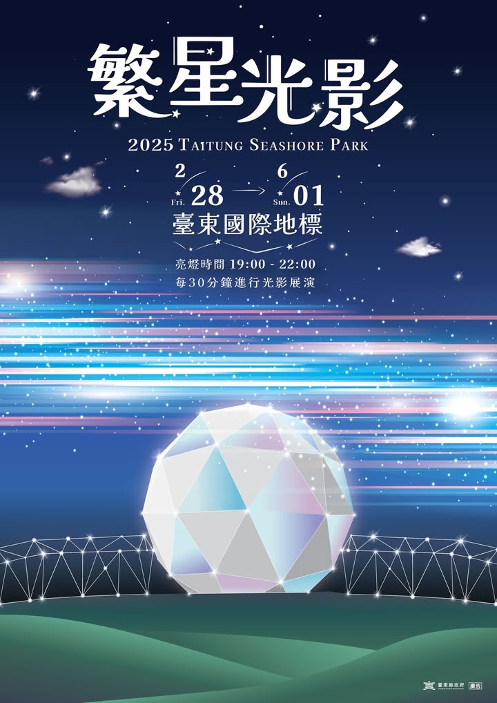 𝟐𝟎𝟐𝟓 繁星光影臺東國際地標 #全新體驗𝟐/𝟐𝟖 𝟏𝟗:𝟎𝟎 #開幕活動 精彩「動態展演」與「無人機共舞」 #首度呈現!僅此一場! 絕對不能錯過(ノ*>∀ 國際地標將在𝟐/𝟐𝟖-𝟔/𝟏為期𝟗𝟒天 結合燈光藝術,融入沉浸式概念與動態展演設計,讓我們一起探索無限可能! 主視覺海報歡迎大家前往以下地方索取 #數量有限 #送完為止 1. 台東火車站旅遊服務中心 2. 台東轉運站旅遊服務中心 #繁星光影 𝑇𝐴𝐼𝑇𝑈𝑁𝐺 𝑆𝐸𝐴𝑆𝐻𝑂𝑅𝐸 𝑃𝐴𝑅𝐾 展期|𝟐/𝟐𝟖-𝟔/𝟏 亮燈|𝟏𝟗:𝟎𝟎-𝟐𝟐:𝟎𝟎,每𝟑𝟎分鐘進行光影展演 地點|臺東國際地標(海濱公園) #台東旅遊 #台東景點 #台東夜景 - 2025-02-15