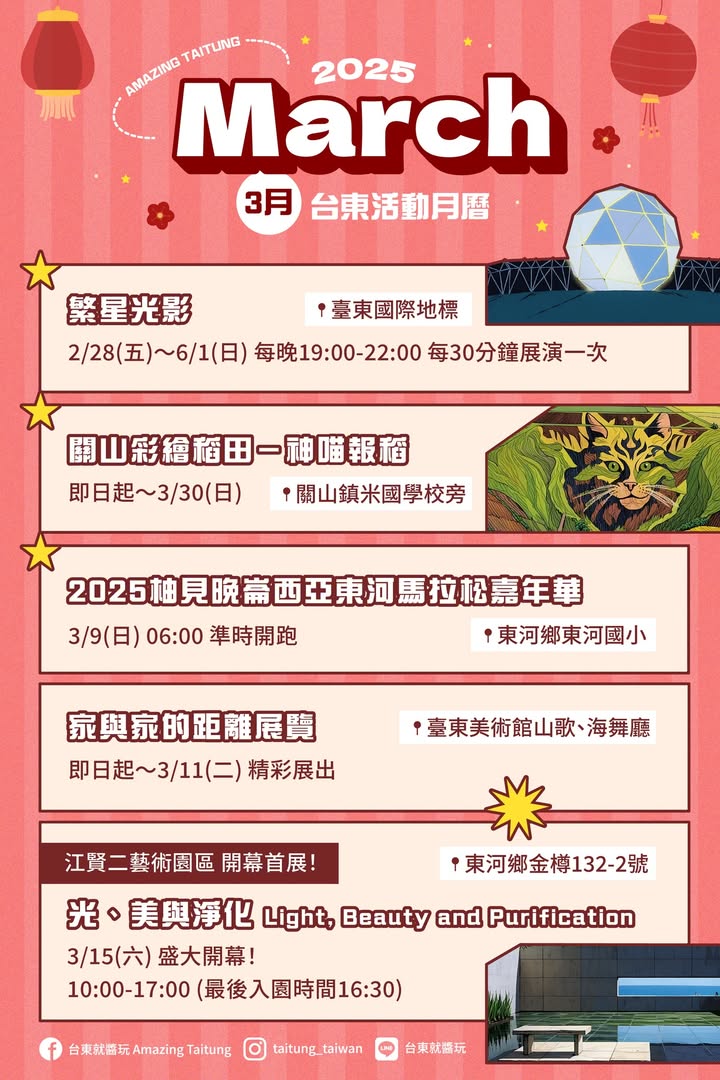 春神來了怎知道~台東3月充滿鳥語花香好療癒 本月重大活動一起Follow來分享 ️台東國際地標化身「繁星光影」 全新造型!就在228連假閃亮登場 ️關山彩繪稻田-神喵報稻 活動到3/30,把握機會快來拍美照 ️2025柚見晚崙西亞東河馬拉松嘉年華 一起來路跑吃晚崙西亞吧! ️江賢二藝術園區盛大開幕 3/15 全新展覽,藝文氣息領域展開 快快分享給好友,一起就醬玩台東 臺東縣關山鎮公所 臺東縣關山鎮公所 江賢二藝術園區 Paul Chiang Art Center 關山鎮農會 #台東 #馬拉松 #關山 #東河 #彩繪稻田 #江賢二 #台東就醬玩 - 2025-02-20