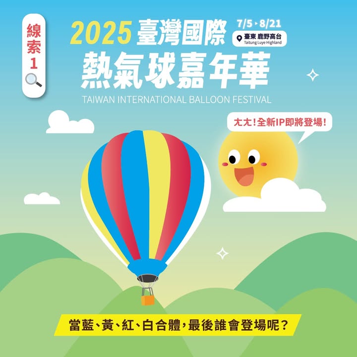 臺灣國際熱氣球嘉年華神秘「新朋友」即將登場! 𝟭𝟱週年大驚喜,快來一起猜猜看 提示:藍 黃 紅 白 這些顏色加在一起會是誰呢? 想知道更多線索!快追蹤起來 鎖定 臺灣國際熱氣球嘉年華-Taiwan International Balloon Festival 下一個提示超重要,千萬別錯過 𝟯/𝟯𝟬(日) 熱氣球記者會正式公開! 將以 #無人機 揭曉新朋友及登場資訊 #台東 #台東景點 #台東旅遊 ##熱氣球嘉年華 - 2025-03-12