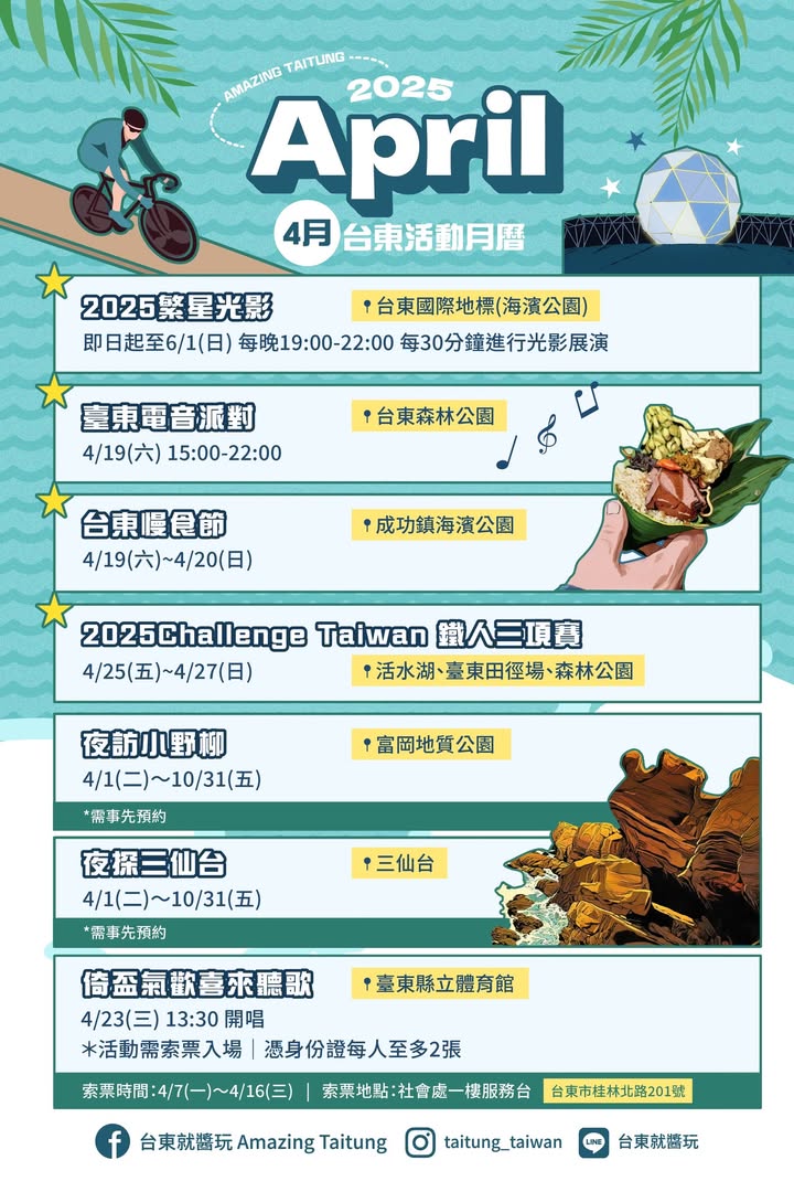 台東真4好好玩 .ᐟ.ᐟ4/1 起精彩活動玩不完٩(˃̶͈̀௰˂̶͈́)و 還有機會將好禮帶回家 ️2025繁星光影 19:00 開始於台東國際地標 每𝟑𝟎分鐘進行光影展演 ️4/19(六) 臺東電音派對 15:00開趴!台東森林公園等你來 ️4/19(六) ~20(日) 台東慢食節,感受台東慢生活 夜訪小野柳及三仙台活動開跑 立即查看「留言處」報名資訊 快快分享給好友,一起就醬玩台東 【Nga'ayho】你好,東海岸 小野柳自然教室 海洋環境教室 慢食臺東 Slow Food Taitung 臺東縣成功鎮公所 #台東 #活動 #台東活動 #台東景點 #台東旅遊 #台東就醬玩 - 2025-03-20