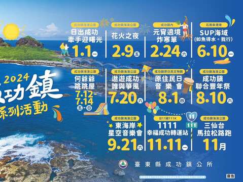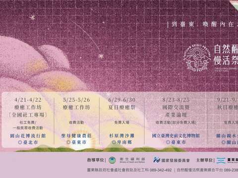 在臺東,有許多活動及節慶,展現臺東之美的藝術節、歌聲悠揚的音樂季、原住民傳統節慶及在地餐桌上的慢食美味,多采多姿的活動值得一再參與,無論選擇何時造訪都能獲得不一樣的感動!前進臺東,感受屬於我們的慢活步調。