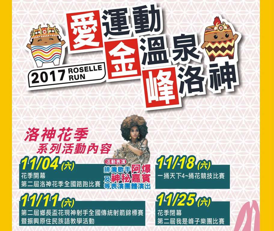 金峰鄉公所於11/1-30辦理洛神花季系列活動,包括11/4「洛神花季全國路跑」、11/11全國傳統射箭、11/18「一捅天下4-群英爭霸」及11/25「我是峰子-進擊的樂團」樂團競賽等每周六都有主題活動,邀請大家到南迴地區渡過一個精彩的11月!