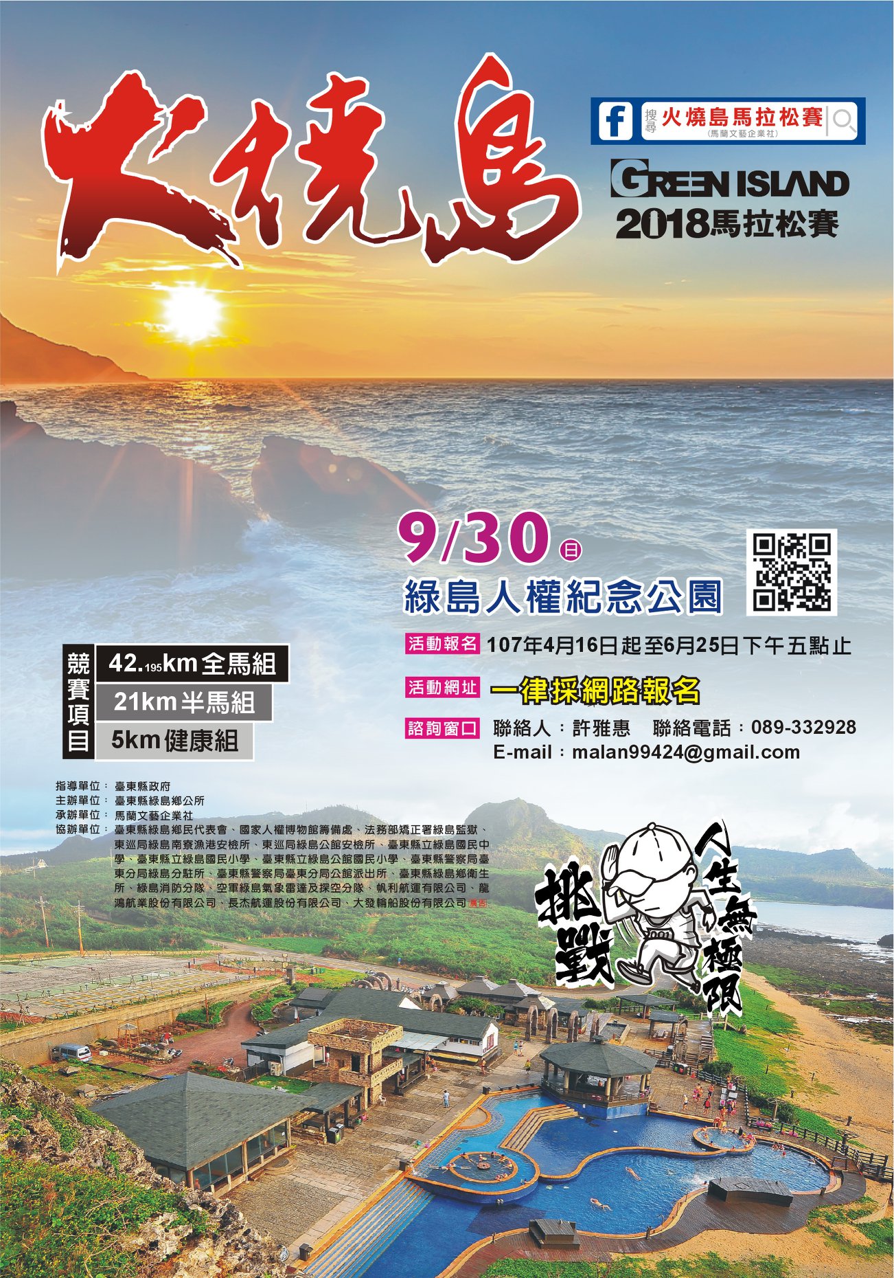 綠島鄉公所主辦「2018火燒島全國馬拉松」將於9月30日綠島環島公路開跑!即日起自6/25開放報名,沿途經過南寮漁港、人權紀念園區,哈巴狗與睡美人、柚子湖,在藍天碧海之中,飽覽綠島美麗風光~歡迎大家踴躍參加!!