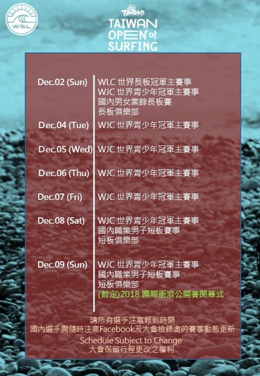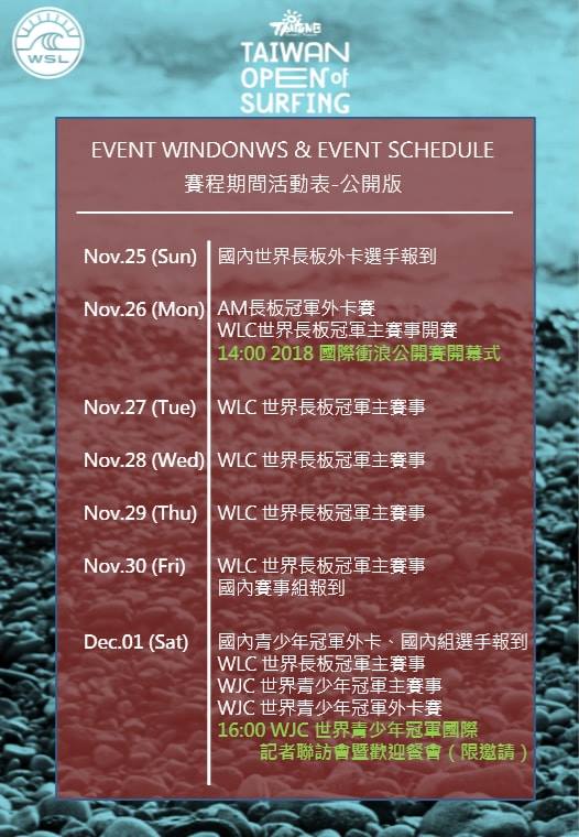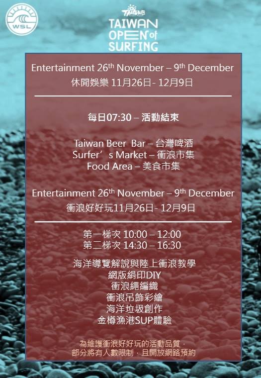 詳情請參閱2018臺灣國際衝浪公開賽活動官網:2018臺灣國際衝浪公開賽活動官網
