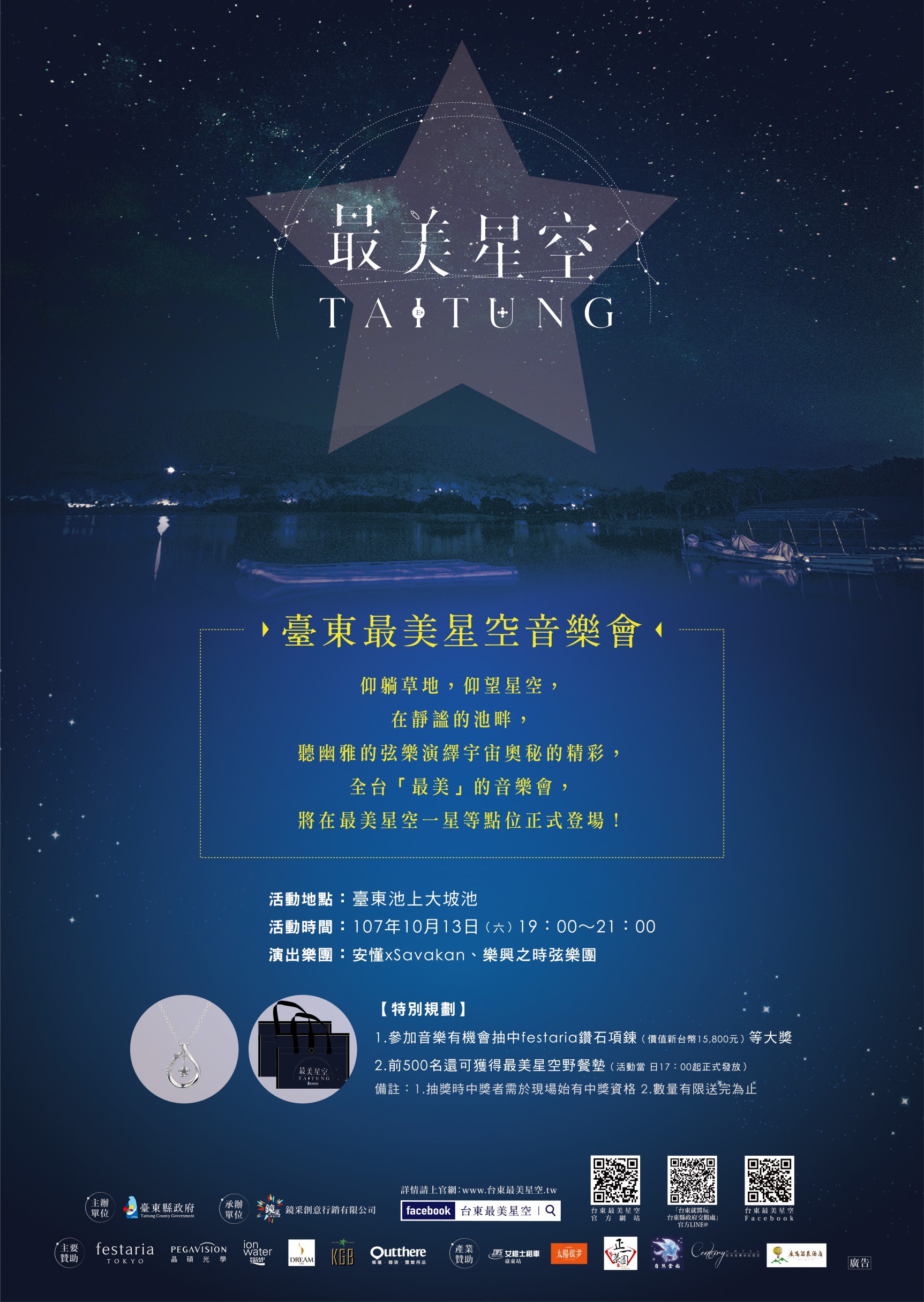 今年首度舉辦的【台東最美星空音樂會】也將於10/13(六)晚上七點,於剛選出來的一星等點位-池上鄉大坡池舉辦,邀請到知名世界級管弦樂團-樂興之時,以及曾獲兩屆鐵花村樂團比賽第一名、來自台東卑南族建和部落的安懂 x SAVAKAN樂團現場演出;當天活動全部免費入場!來參與的民眾不僅可參加抽獎活動,更有機會抽中由festaria Tokyo獨家贊助總價值超過兩萬元的超美鑽石項鍊,前500名抵達現場的民眾更可免費獲得活動獨家特製的最美星空野餐墊!誠摯邀請所有民眾踴躍參加,一起享受徜徉在最美星空下欣賞音樂的樂趣!
