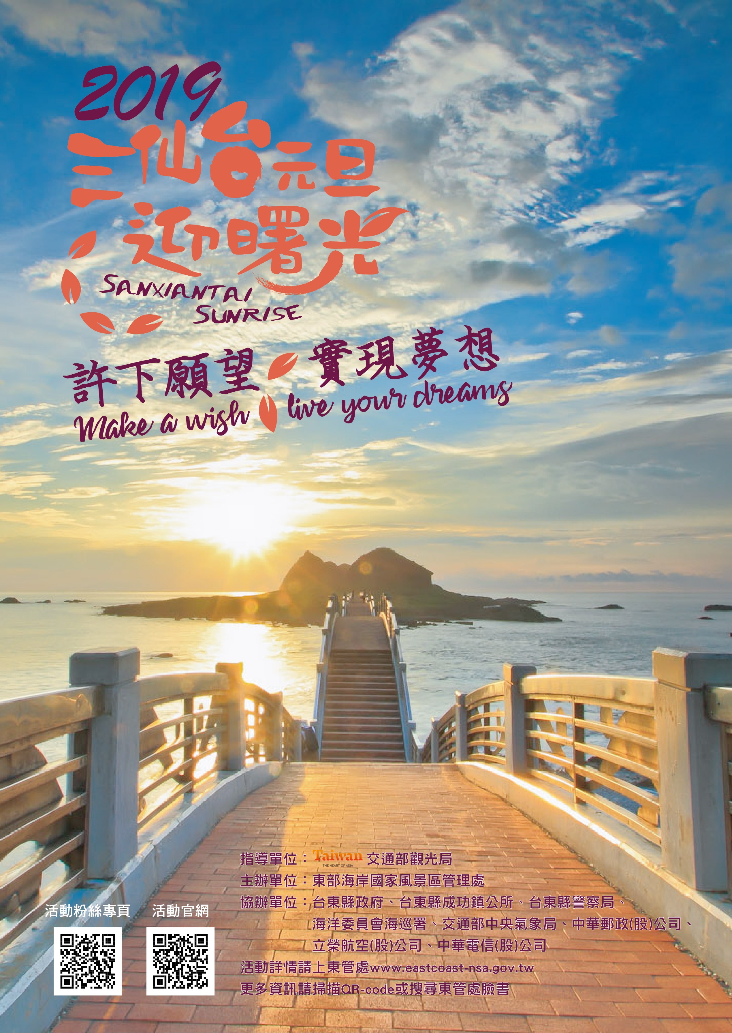 更新日期:2023-12-15發佈單位:臺東縣政府3156分享到FacebookTweet分享到微博LINE 給好友活動時間 2019-01-01活動地點 臺東縣成功鎮三仙里基翬路74號 電話 089-841520#1604各活動時間以主辦單位最新公告為主 加入Google行事曆 訊息內容在全台第一道曙光灑落的三仙台,與來自全台各地民眾一起迎接2019年第一道曙光,互相祝福新的一年幸福開心、好運連連。 附件檔案2019三仙台第一道曙光新聞稿1214(.doc)相關照片