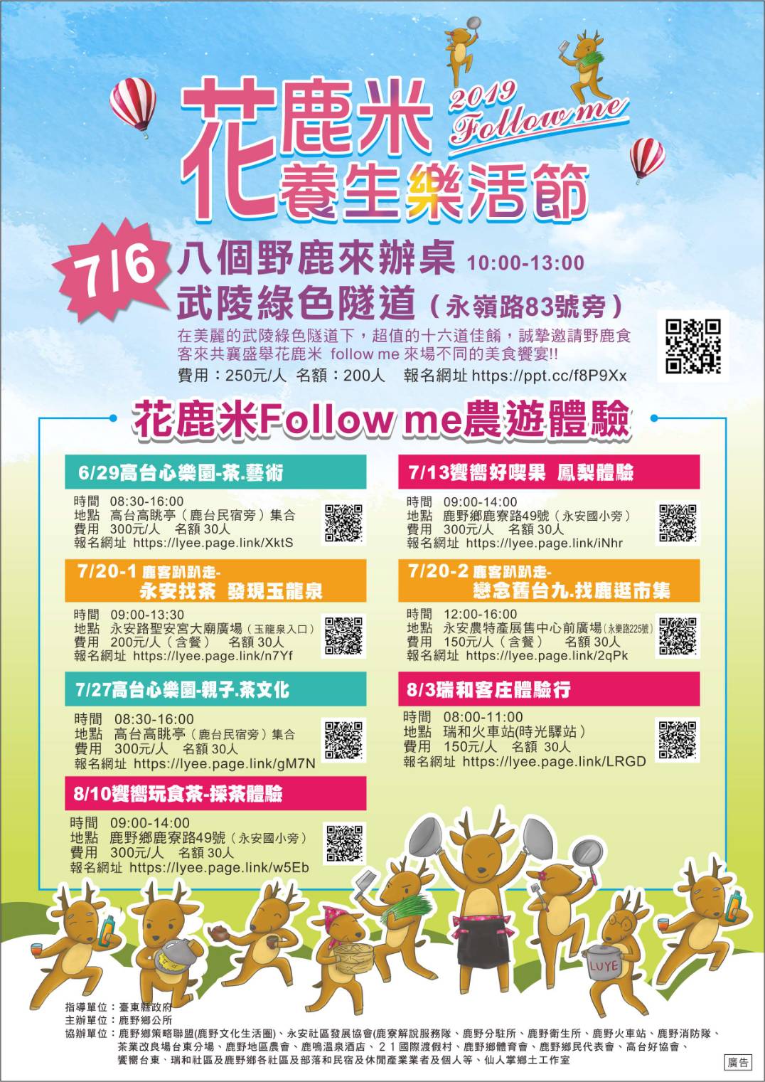 配合七八月份熱氣球嘉年華活動,以在地食材結合在地風景及人文為主題,「花鹿米」為活動口號,除了分享鹿野是梅花鹿的故鄉之外,米在農村有「茶米」及「稻米」的雙重意義,同時也是鹿野鄉的兩大農特產,另外更採「follow me」的英文意義,請跟隨在地人來體驗鹿野人的樂活美學。