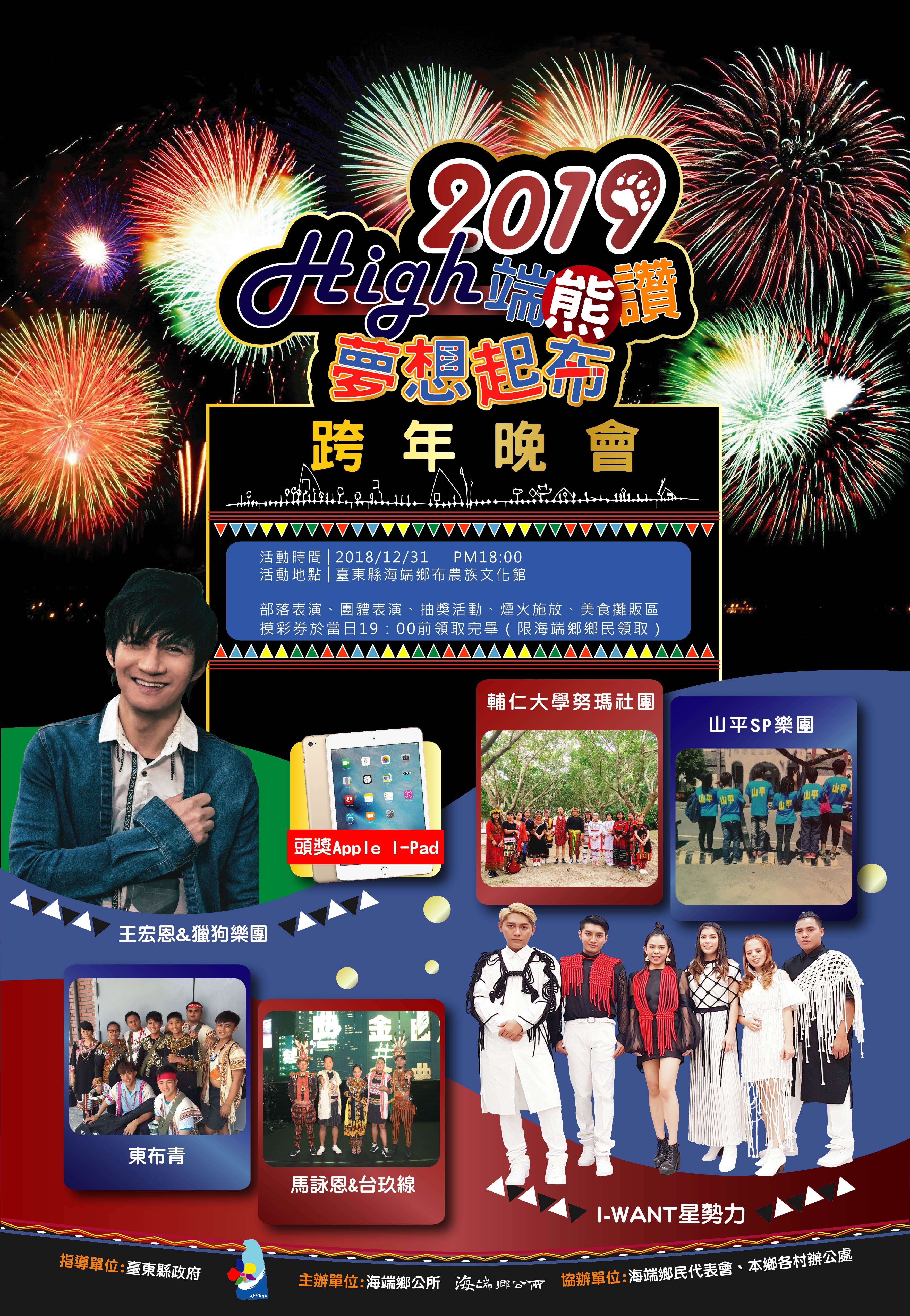 更新日期:2019-11-05發佈單位:臺東縣政府3656分享到FacebookTweet分享到微博LINE 給好友活動時間 2018-12-31~2019-01-01活動地點 臺東縣海端鄉台東縣海端鄉海端村山平2鄰56號 電話 089-931370各活動時間以主辦單位最新公告為主 加入Google行事曆 訊息內容由海端鄉公所主辦「2019 High端熊讚 夢想起布」海端鄉跨年晚會活動自2018年12月31日19:00至2019年1月1日00:00,於海端鄉布農族文化館前方廣場舉辦,活動項目包含:部落表演、團體表演、煙火施放、美食攤販區等,歡迎大家踴躍參加。相關連結海端鄉公所網站相關照片