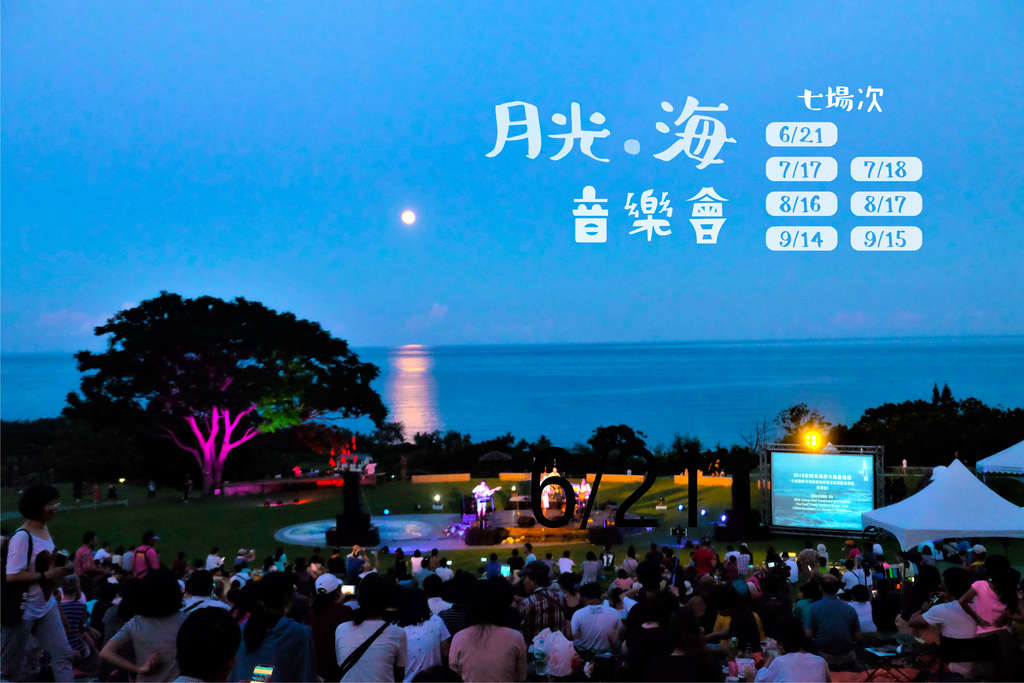 「月光•海音樂會」主要以自然景觀做為舞台背景,藉由月升日落浪起潮退等自然現象的動態展演,具體而微隱喻了大地藝術節想要表達的閒暇哲學與東海岸生活的美學風格。