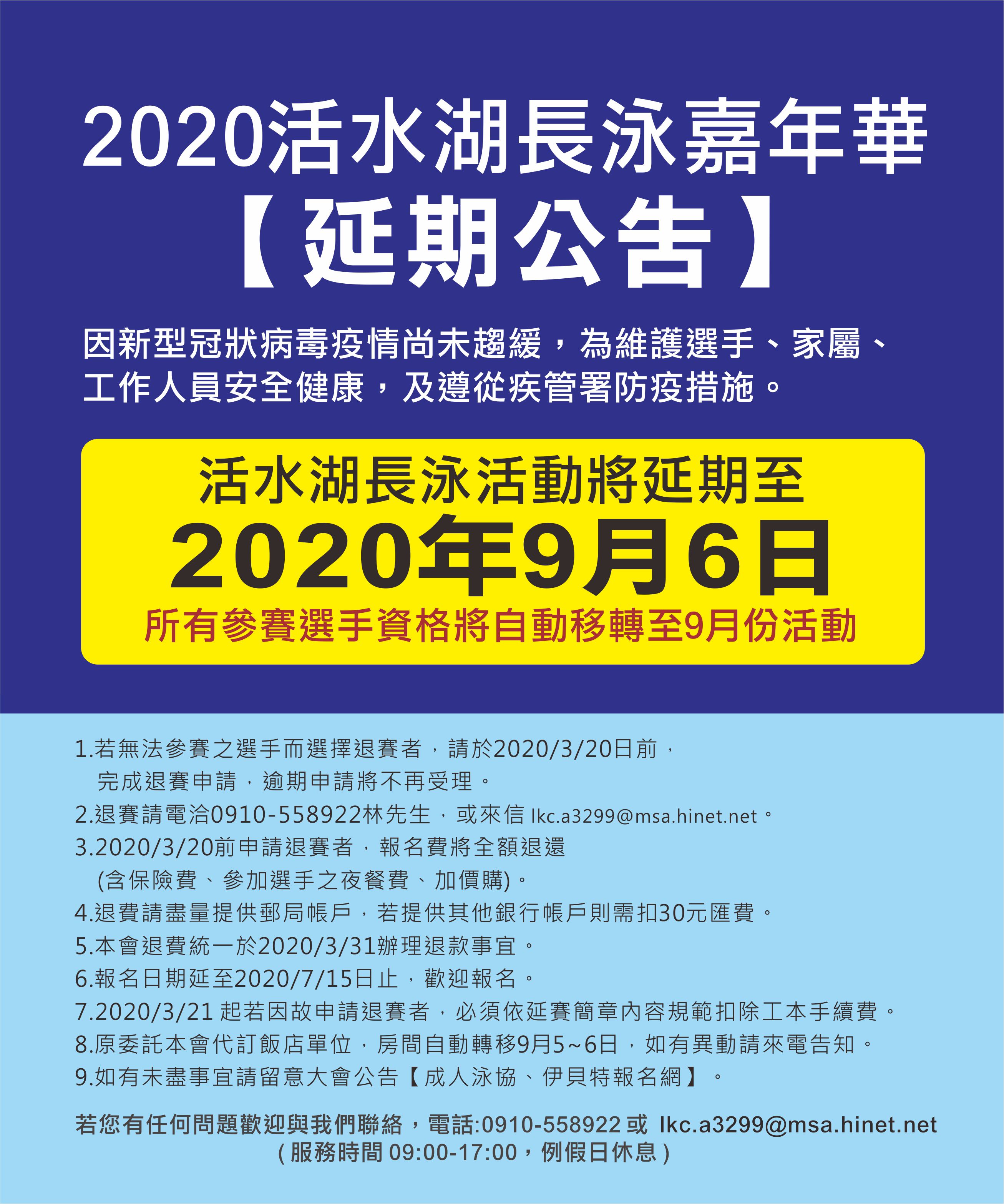 更新日期:2020-03-16發佈單位:臺東縣政府6361分享到FacebookTweet分享到微博LINE 給好友 活動時間 2020-09-06活動地點 臺東縣臺東市臺東市森林公園活水湖 電話 0910-558922各活動時間以主辦單位最新公告為主 加入Google行事曆 訊息內容為提倡國民正當休閒運動,增進身心健康,培養堅強毅力、耐力,肯定自己對長泳之能力,特以運動結合觀光業、農產業,帶動地方經濟繁榮。 相關連結臺東縣超級鐵人三項協會相關照片