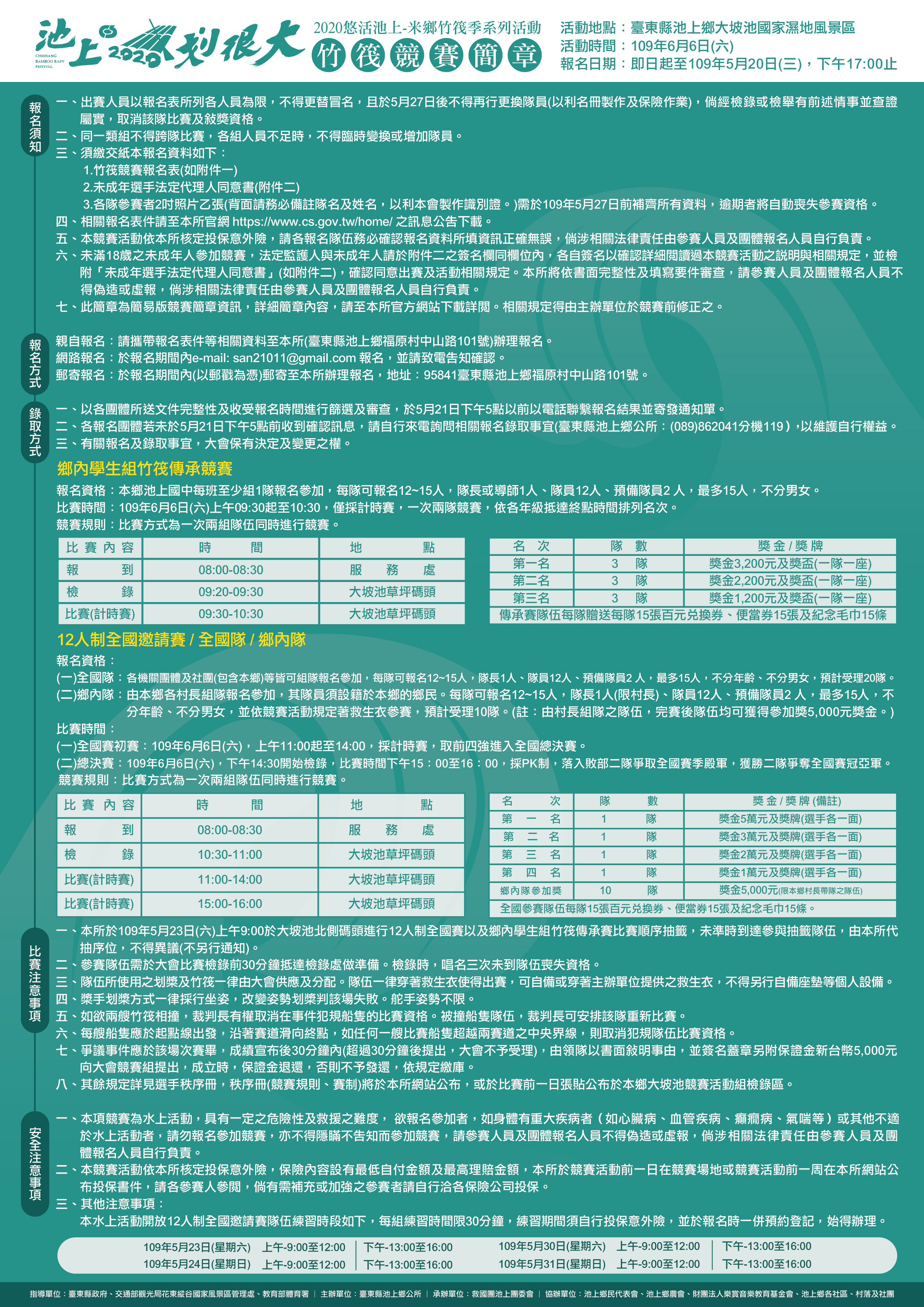 2020悠活池上米鄉竹筏季系列活動竹筏競賽冠軍獎金五萬元,競賽報名時間自即日起至109年5月20日(星期三)下午17時。詳細活動報名資訊請至池上鄉公所官方網站查詢(https://www.cs.gov.tw/home/index.php/news/2019-05-28-03-46-46/985-2020-3)。