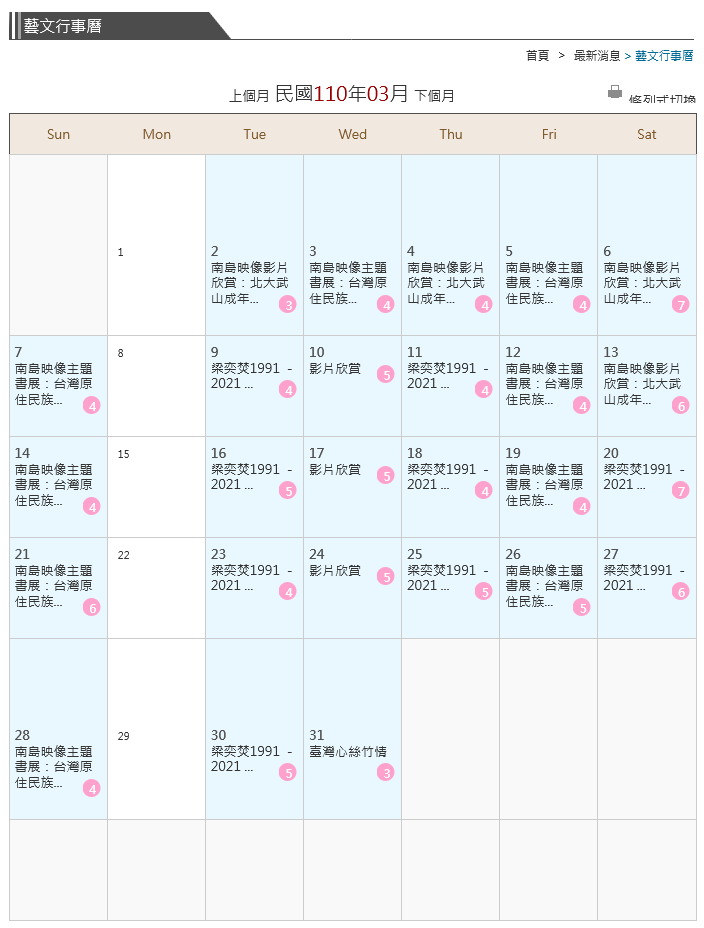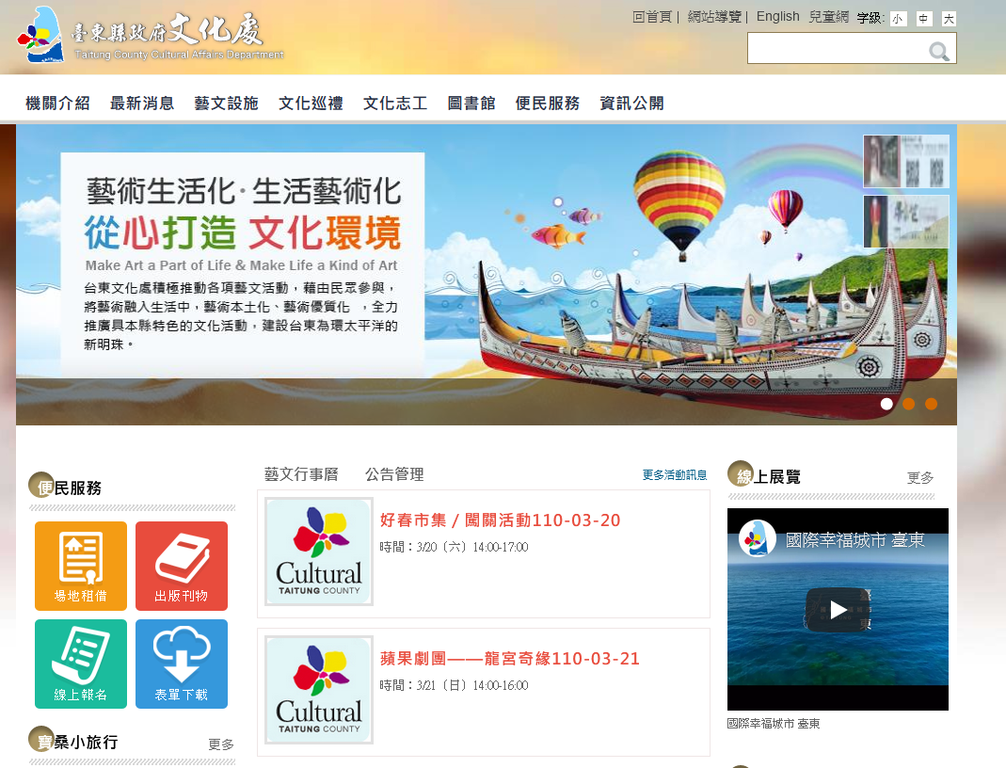 更新日期:2024-10-30發佈單位:臺東縣政府9181分享到FacebookTweet分享到微博LINE 給好友 活動時間 2021-01-01~2021-12-31活動地點 臺東縣臺東市臺東縣境內 電話 089-320378各活動時間以主辦單位最新公告為主 加入Google行事曆 訊息內容縣內最完整文化活動行事曆,請參閱文化處網站。 相關連結台東藝文活動行事曆相關照片