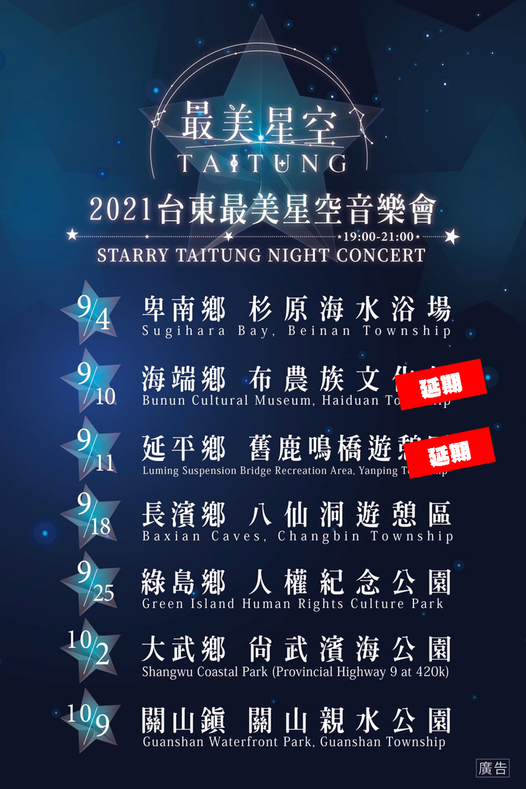 因受璨樹颱風接近影響,為維護民眾及相關人員安全,原訂9月10日(五)海端鄉 布農族文化館及9月11日(六)延平鄉 舊鹿鳴橋遊憩區兩場台東最美星空音樂會場次,經由評估後確認延期至10/1(五)