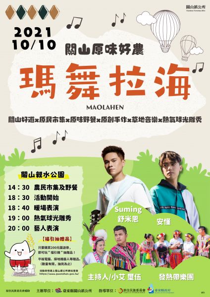 更新日期:2024-09-16發佈單位:臺東縣政府2153分享到FacebookTweet分享到微博LINE 給好友活動時間 2021-10-10活動地點 臺東縣關山鎮隆盛路1號 電話 089-811179各活動時間以主辦單位最新公告為主 加入Google行事曆 訊息內容2021年10月10日將於關山鎮親水公園辦理「關山原味好農-瑪舞拉海」活動,將邀請阿美族歌手Suming舒米恩、聲林之王安懂與發熱帶樂團獻唱,活動除了舉辦草地音樂會及原民市集之外,還有壓軸熱氣球光雕秀,趁此佳節舉辦活動,敬邀您一起體驗並感受關山的小鎮風情。相關連結關山鎮公所官網相關照片