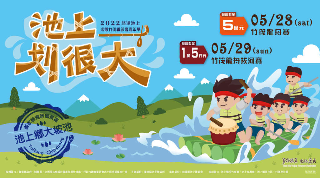 2022悠活池上-米鄉竹筏季系列活動『竹筏節慶嘉年華』訂於111 / 5 /28(六)至5 / 29(日)於臺東縣池上鄉大坡池國家濕地風景區舉行,其中水上竹筏競賽活動已開放報名(至111年5月12日(四)下午5時止)。