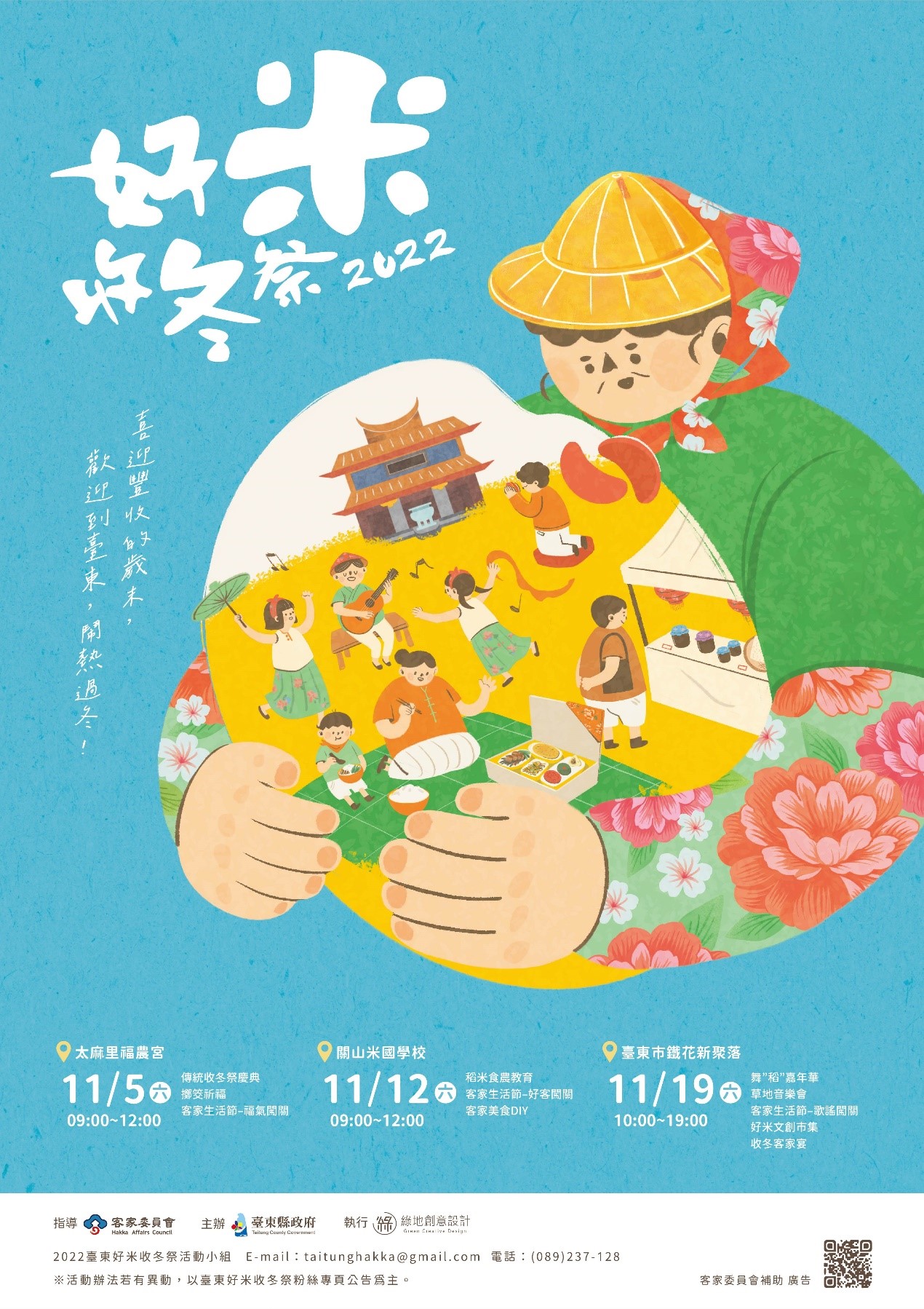 民政處指出,臺東好米收冬祭在「臺東客家月」期間,每周六將安排不同類型的客家活動,除11月5日「好米收冬祭典」,11月12日在關山米國學校的闖關親子活動也受理報名中,壓軸場11月19日在鐵花新聚落則有舞「稻」嘉年華、收冬客家宴、好米文創市集、及客家歌手雲集的草地音樂會,精采可期,歡迎共下寮收冬! 相關活動內容資訊請查詢「臺東好米收冬祭」臉書粉絲專頁(https://www.facebook.com/hakka.taitung),或電洽「臺東好米收冬祭」工作小組 089-237128、臺東縣政府民政處客家事務科簡小姐089-327344。