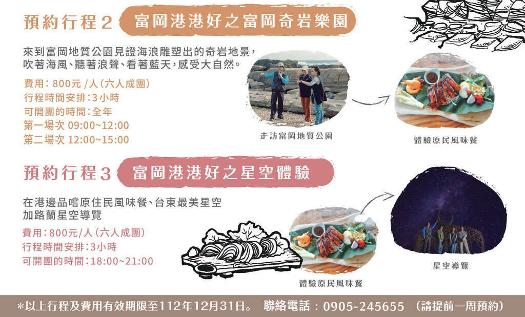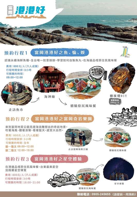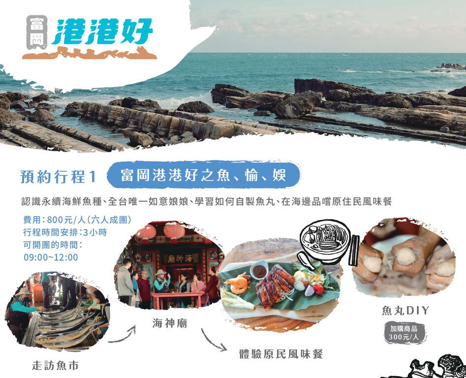 - 行程1:富岡港港好之魚、愉、娛 (認識永續海鮮魚種、全台唯一如意娘娘、學習如何自製魚丸、在海邊品嘗原住民風味餐)