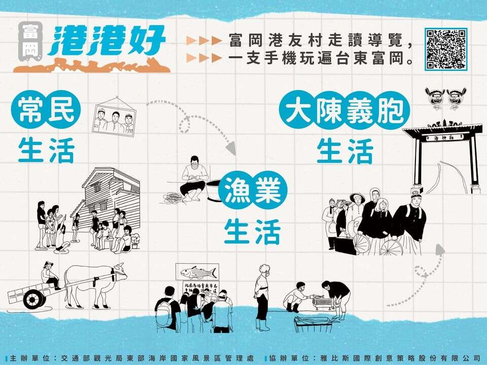 以「富岡漁村生活」及「海岸地質地景」為核心,發想富岡小鎮品牌。邀請旅人感受富岡的純樸及生活日常,探索海浪雕塑出來的地景藝術 。