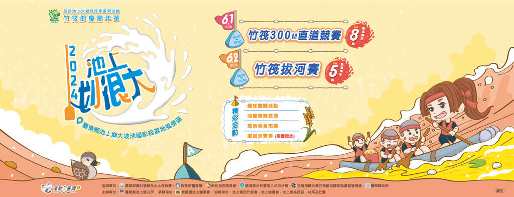池上鄉年度盛事將邁入第23週年-「2024悠活池上米鄉竹筏季活動」,將於113年6月1日至6月2日舉行,每年號召全民好手組隊共襄盛舉,2024池上划很大邀請全國好手一起來挑戰奪獎金!!!