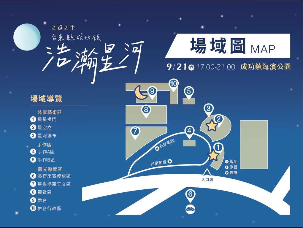 更新日期:2025-04-09發佈單位:臺東縣政府4503分享到FacebookTweet分享到微博LINE 給好友 活動時間 2024-09-28活動地點 臺東縣成功鎮海濱公園 電話 089-851004各活動時間以主辦單位最新公告為主 加入Google行事曆 訊息內容2024台東縣成功鎮浩瀚星河音樂會 一起坐在草坪上賞星空、吃美食、聽音樂 ❚活動日期:9月28日(六) ❚活動時間:17: 00 ⇀ 21: 00 ❚活動地點:臺東縣成功鎮海濱公園相關連結成功鎮公所官網Free Fly成功任我行facebook臺東縣成功鎮公所|FB相關照片