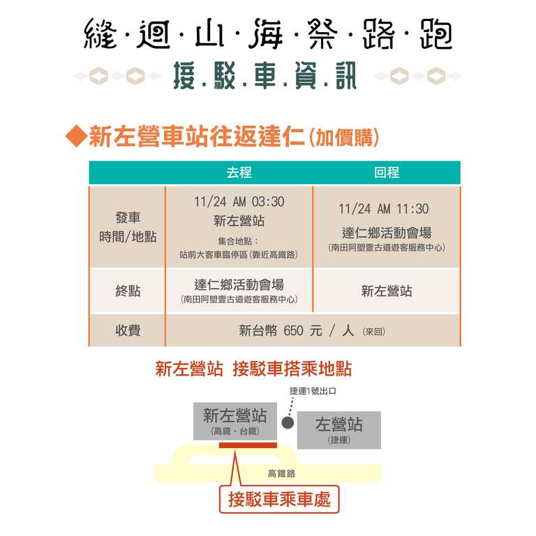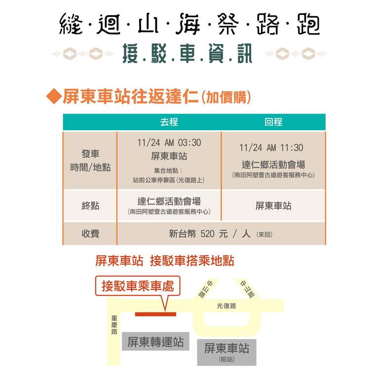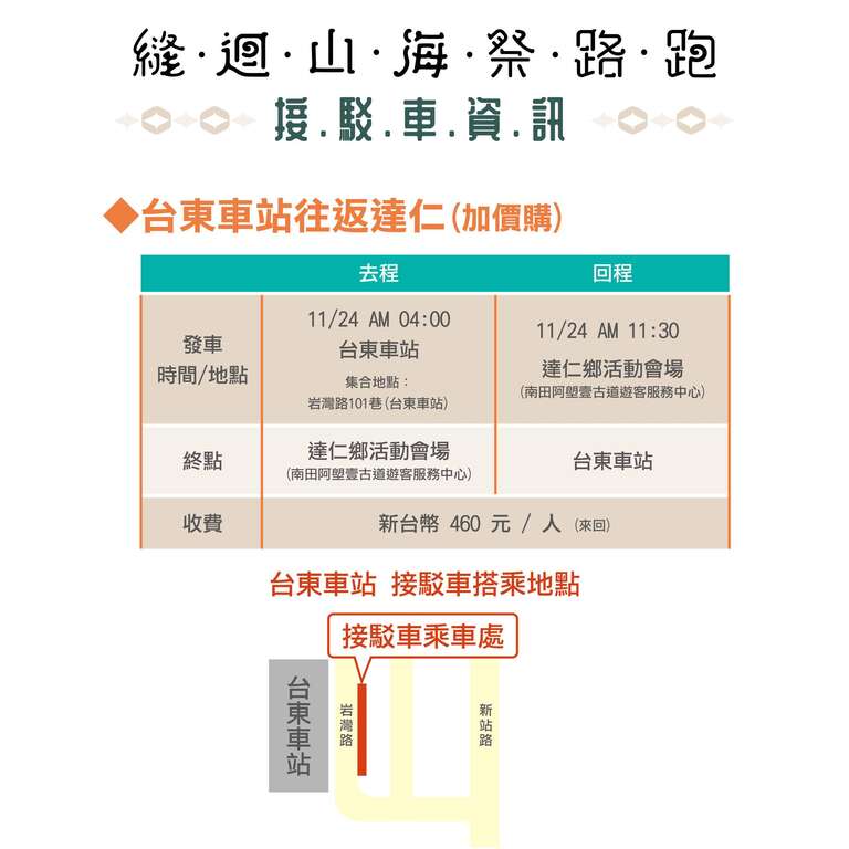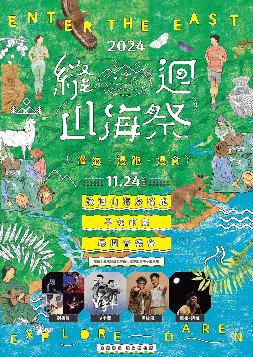更新日期:2024-12-08發佈單位:臺東縣政府7984分享到FacebookTweet分享到微博LINE 給好友活動時間 2024-11-24活動地點 臺東縣達仁鄉南田阿塱壹古道遊客服務中心 電話 089-702249各活動時間以主辦單位最新公告為主 加入Google行事曆 訊息內容路跑・音樂會・市集・小旅行 阿塱壹古道前方,首次舉辦路跑享受山海美景! 來自達仁的排灣好音樂,南田海邊帶來早晨滿滿能量! 達人好物品牌,齊聚晨間市集帶來純正好貨! 縫迴達仁景點故事,小旅行探訪排灣族群文化! 日 期|2024.11.24 (日) 時 間|路跑 6:00|市集音樂會 8:00 -13:00 地 點|台東縣達仁鄉南田遊客服務中心前廣場 👉路跑報名連結 👉手作體驗報名連結 相關連結達仁鄉公所官網達仁鄉公所臉書縫迴山海 - 阿塱壹遇見達仁路跑活動|報名連結手作體驗|報名連結相關照片