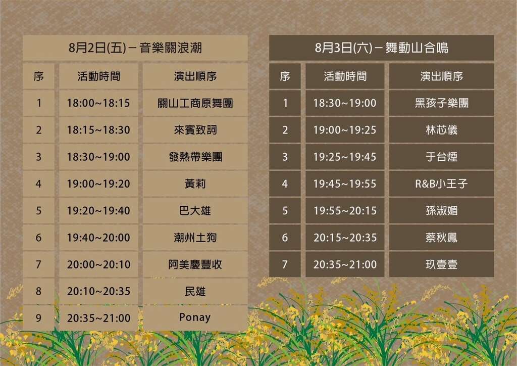 更新日期:2024-07-31發佈單位:臺東縣政府2810分享到FacebookTweet分享到微博LINE 給好友活動時間 2024-08-02~2024-08-03活動地點 臺東縣關山鎮中華路101號(關山國小) 各活動時間以主辦單位最新公告為主 加入Google行事曆 訊息內容2024臺東 巴歌浪一起關山 ✦ 時間|2024/08/02 - 08/03 ✦ 地點|臺東關山國小操場 -----免費入場----- 出演卡司 🎵 08/02 Ponay的原式cover、民雄、黃莉、巴大雄、潮州土狗 🎵 08/03 孫淑媚、蔡秋鳳-粉絲談心坊、玖壹壹、于台煙、林芯儀 Shennio Lin 主持人:盧學叡 Afalian Lufic相關連結臺東縣關山鎮公所|FB相關照片