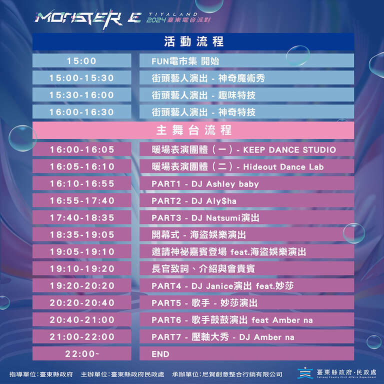活動卡司:日本冠軍DJ-Natsumi、甜辣系個性女神DJ Alyshia 、HITO流行音樂最佳唱作歌手 鼓鼓 呂思緯、超強新人動感舞姬Miusa、台東之光百大DJ女神DJ Janice、亞洲百大女DJ-Amber na、音樂精靈混血甜心DJ-Ashley Baby、海盜娛樂、KEEP DANCE STUDIO。