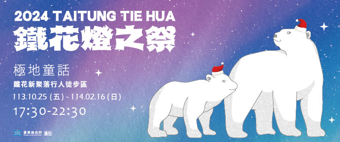 鐵花燈之祭【極地童話】以夢幻極地世界為背景,結合冰雪與童話故事元素,除在鐵花市集人行步道規劃絢麗「浪漫天幕」,步道兩端也設置「耶誕禮物盒」和「音樂許願帽」為亮點入口意象,伴隨坐落市集旁草地區高7米的「冰雪白熊」,和璀璨「冰晶企鵝」共同迎接到訪遊客,另一側還有可愛的耶誕帽及枴杖糖,讓人仿佛置身耶誕童話中。