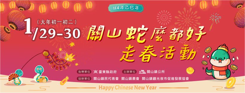 更新日期:2025-01-22發佈單位:臺東縣政府2285分享到FacebookTweet分享到微博LINE 給好友活動時間 2025-01-29~2025-01-30活動地點 臺東縣關山鎮仁愛路(關山國小旁) 電話 089-811179各活動時間以主辦單位最新公告為主 加入Google行事曆 訊息內容藉由擺設特色市集展覽,並有豐富的表演活動如魔術、泡泡秀及勁舞表演,活絡地方新年新氣象,活動現場並有摸彩活動、發放開運金幣等,讓大家在新年有個愉快的啟程。 活動日期|114/1/29-114/1/30 活動地點|關山鎮仁愛路(關山國小旁)相關連結臺東縣關山鎮公所|FB臺東縣關山鎮公所|官網相關照片