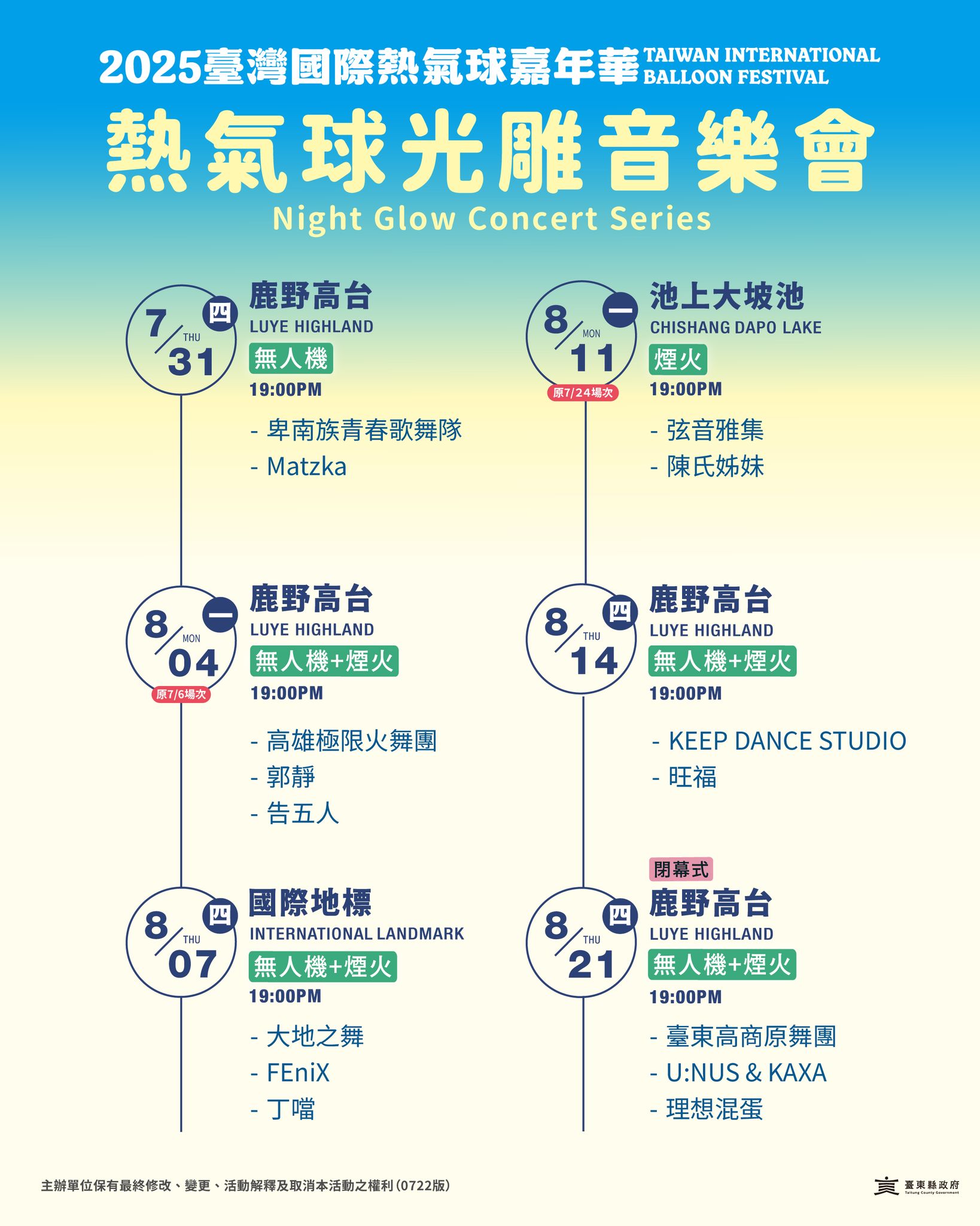 🔺受丹娜絲颱風影響,原訂7/6(日)鹿野高台光雕音樂會,告五人、郭靜、無人機、煙火秀展演,延期至8/4(一)原地舉行!