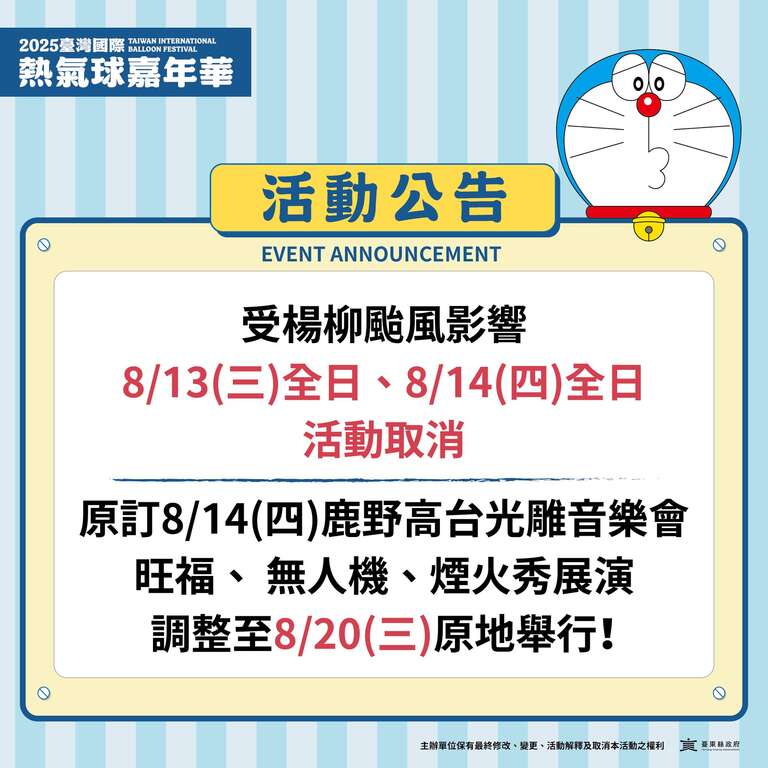 🔺受薇帕颱風外圍環流影響,連日下雨導致場地泥濘!原訂7/24(四)池上大坡池光雕音樂會,延期至8/11(一)舉行!