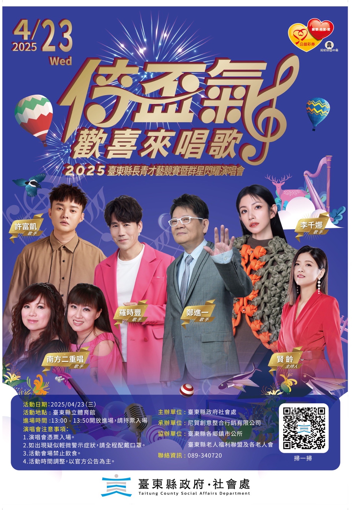 免費索票入場。台東縣籍65歲以上長者,可於4/7㊀-4/18㊄上班時間至社會處一樓服務台、四大社福中心,憑身分證每人限索取2張,長青社團會員可向老人會報名。
