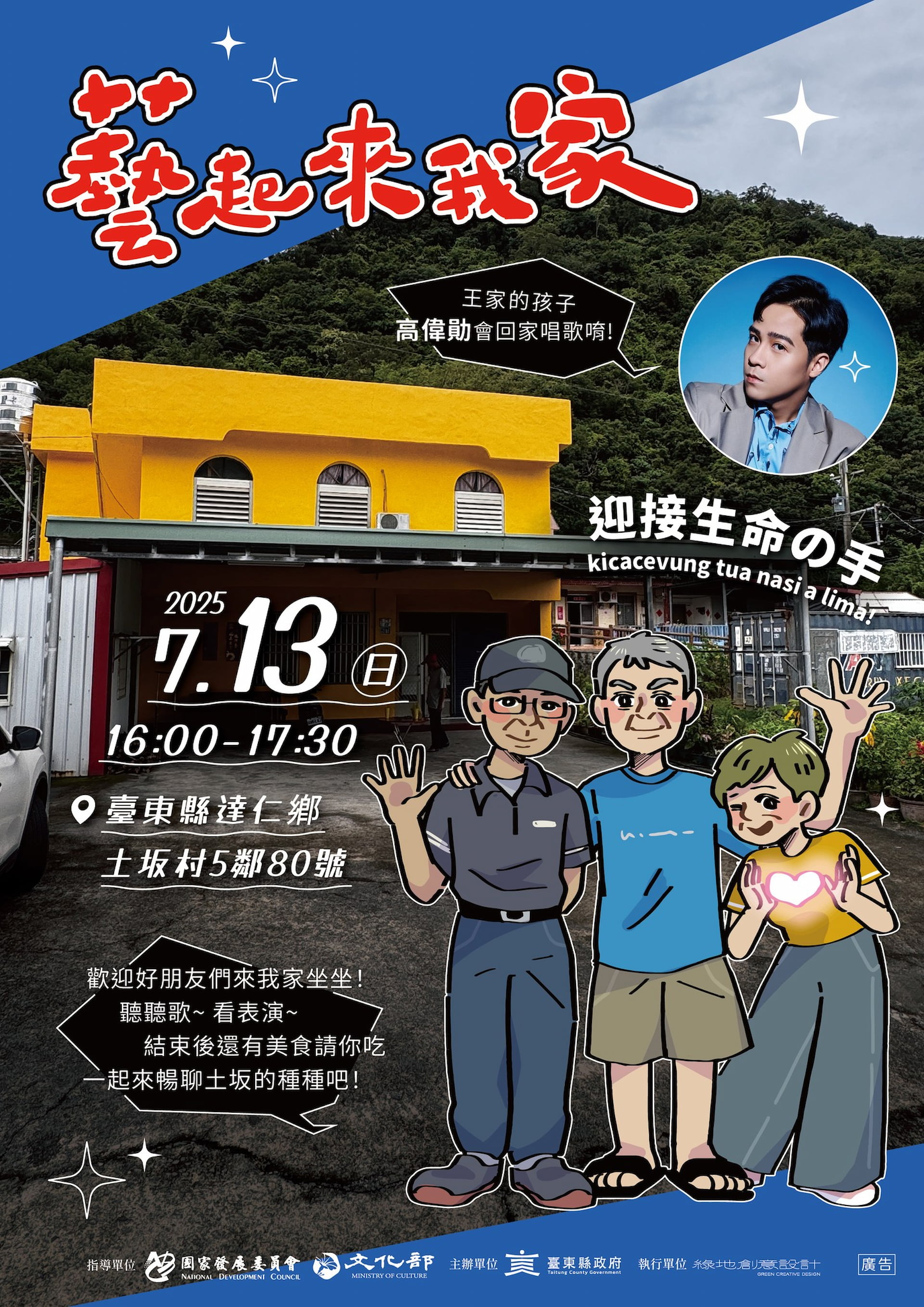 今年第二場藝起來我家庭院分享會,首度走進達仁鄉,邀請大家來聽故事、看表演、串人情 。這次主秀邀請到歌手高偉勛-Shan Hay,還有藝術家現場速寫,為家戶留下最美紀念。