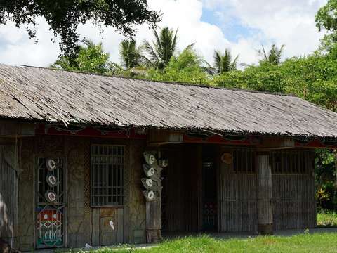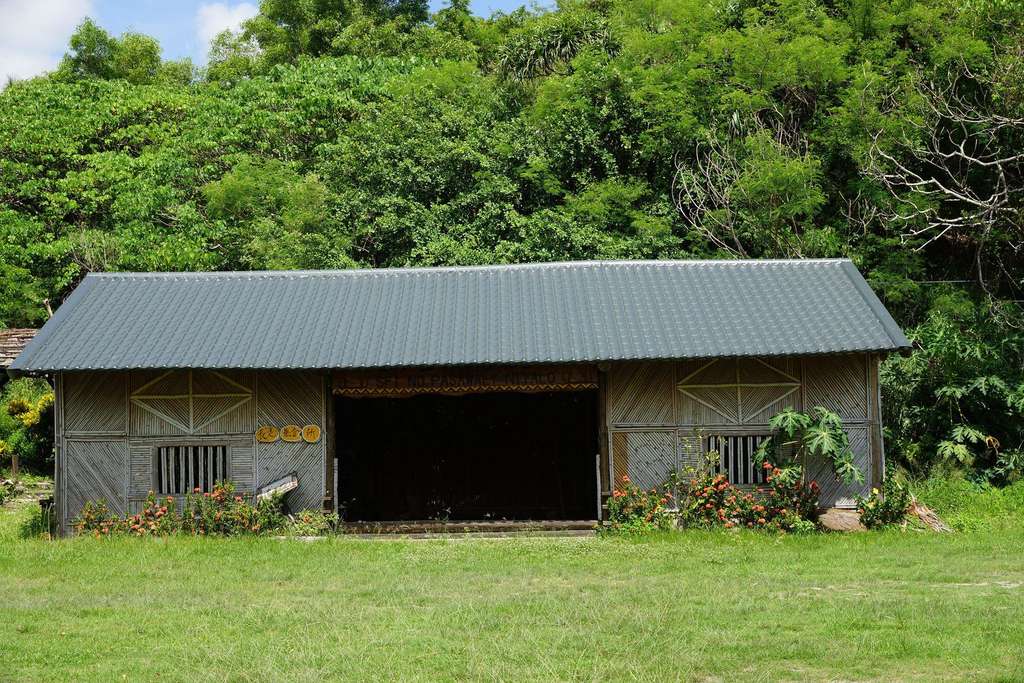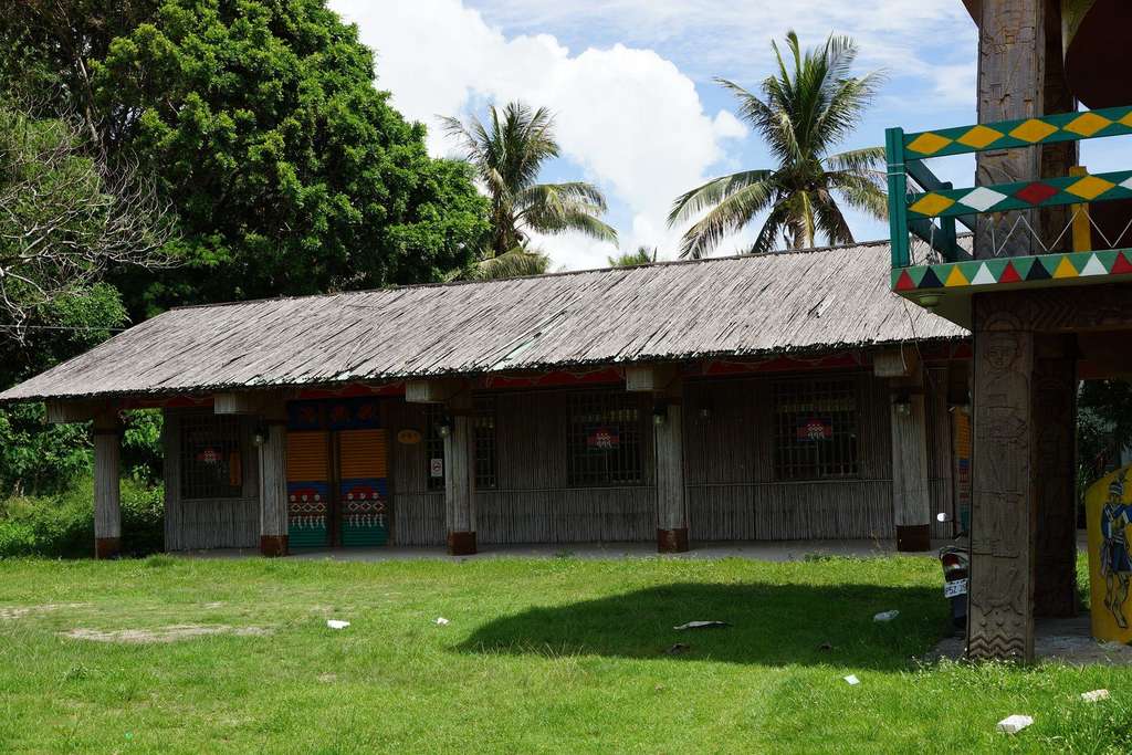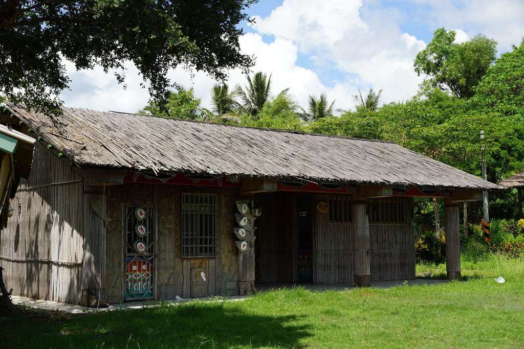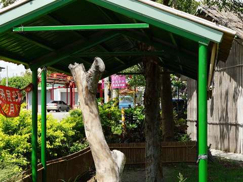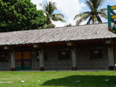 聚會所招牌與石柱皆繪上彩繪圖騰