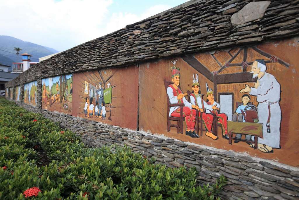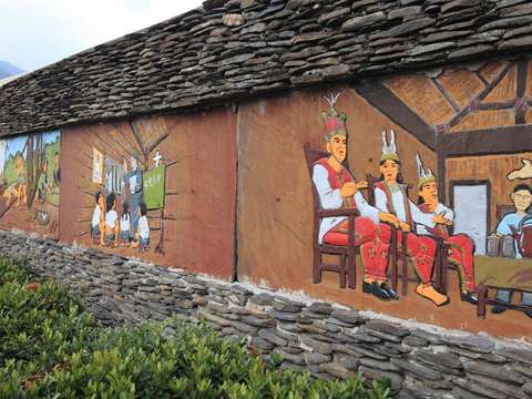 圍牆上彩繪著卑南族起源的神話故事