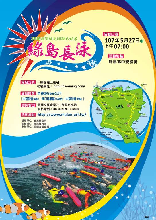 台東縣綠島鄉公所為推動綠島觀光產業永續發展,活絡綠島全民海上運動,特舉辦「2018綠島海上長泳」活動,讓大眾不分老少親身體驗綠島豐富珍貴的海陸資源,認識海洋珊瑚生態,享受大自然之美,並達到宣導自然保育生態觀念。