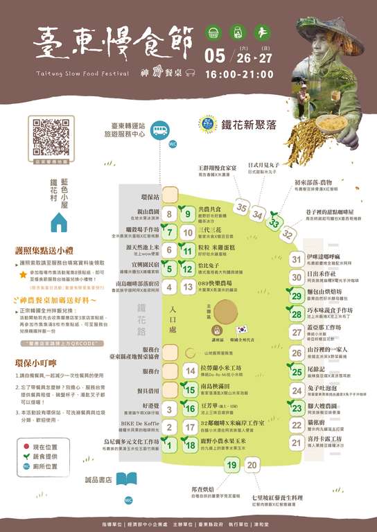 臺東慢食節現場憑證件可至服務台領取「臺東慢食節護照」,更歡迎大家於05/07-06/03期間走訪響應慢食理念的店家,享用主題慢食料理,索取貼紙集點。接下來還有兩場次以慢酒釀及慢海鮮為主題的慢食節活動,活動詳情請持續關注 「台東就醬玩 Amazing Taitung」、「鐵花新聚落」臉書粉絲團。