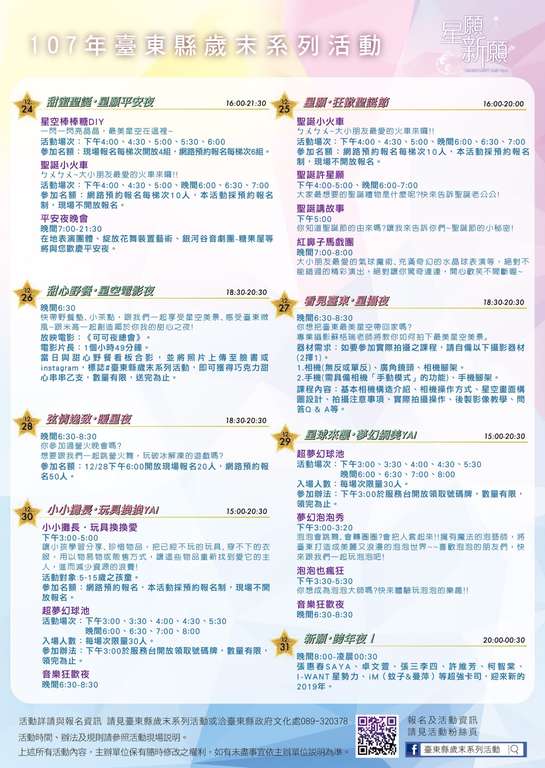 2018臺東縣歲末系列活動「星願新願」於12/24起至12/31在臺東市鐵花新聚落區間辦理精彩、有趣的藝文活動,包括:星空棒棒糖DIY、聖誕講故事、紅鼻子馬戲團、星空電影夜、新願跨年夜…等,無論是大朋友、小朋友,或是本地、外地民眾,期待與您共度歡欣豐盛的歲末,迎接亮麗的新年!