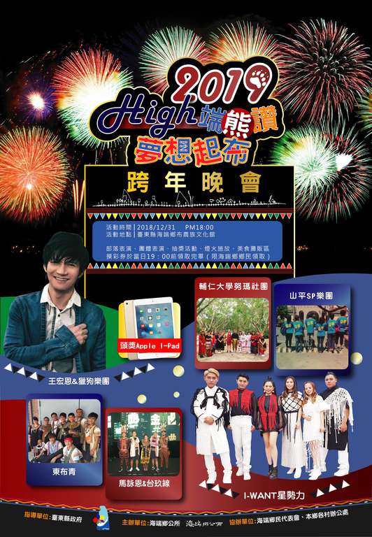 由海端鄉公所主辦「2019 High端熊讚 夢想起布」海端鄉跨年晚會活動自2018年12月31日19:00至2019年1月1日00:00,於海端鄉布農族文化館前方廣場舉辦,活動項目包含:部落表演、團體表演、煙火施放、美食攤販區等,歡迎大家踴躍參加。