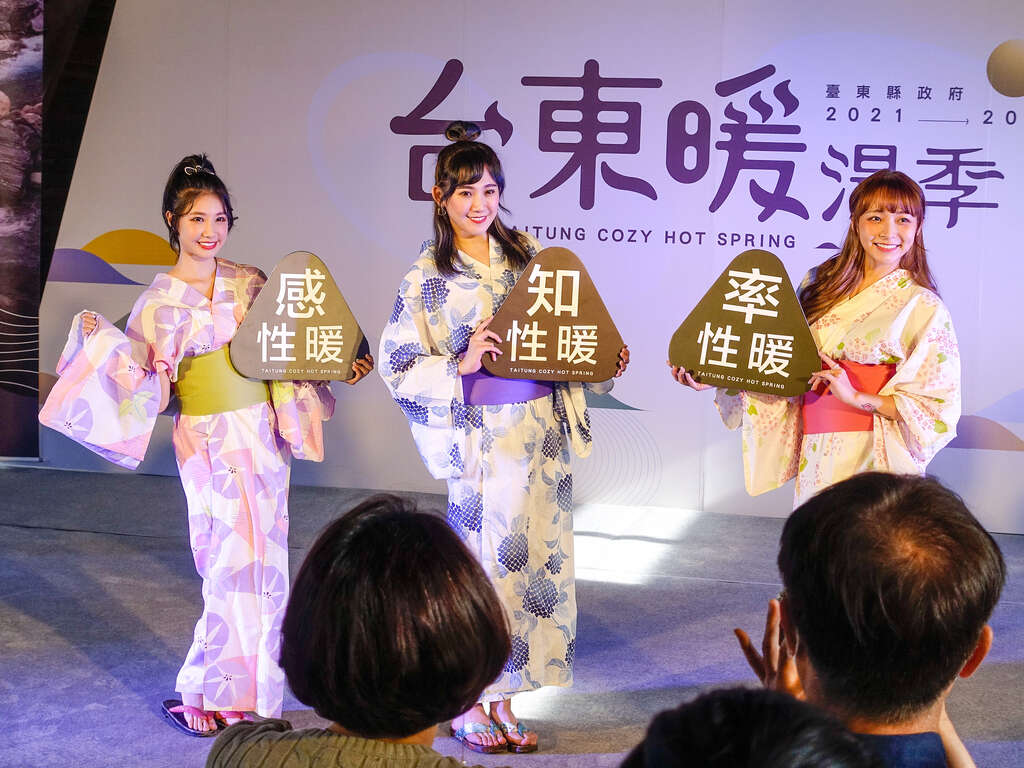 今年的「臺東暖湯季」透過一系列的活動凸顯臺東溫泉品牌,記者會現場邀請樂天女孩筠熹、凱莉絲和林襄穿著代表臺東三種暖特性的浴衣走秀,為首次辦理的「臺東暖浴衣設計比賽」揭開序幕,比賽從12月17日開始徵件,邀請國際服裝設計師沙布喇.安德烈擔任評審長,歡迎全國浴衣設計同好及大專院校學生參賽,詳情可至「臺東暖湯季」臉書查詢。
